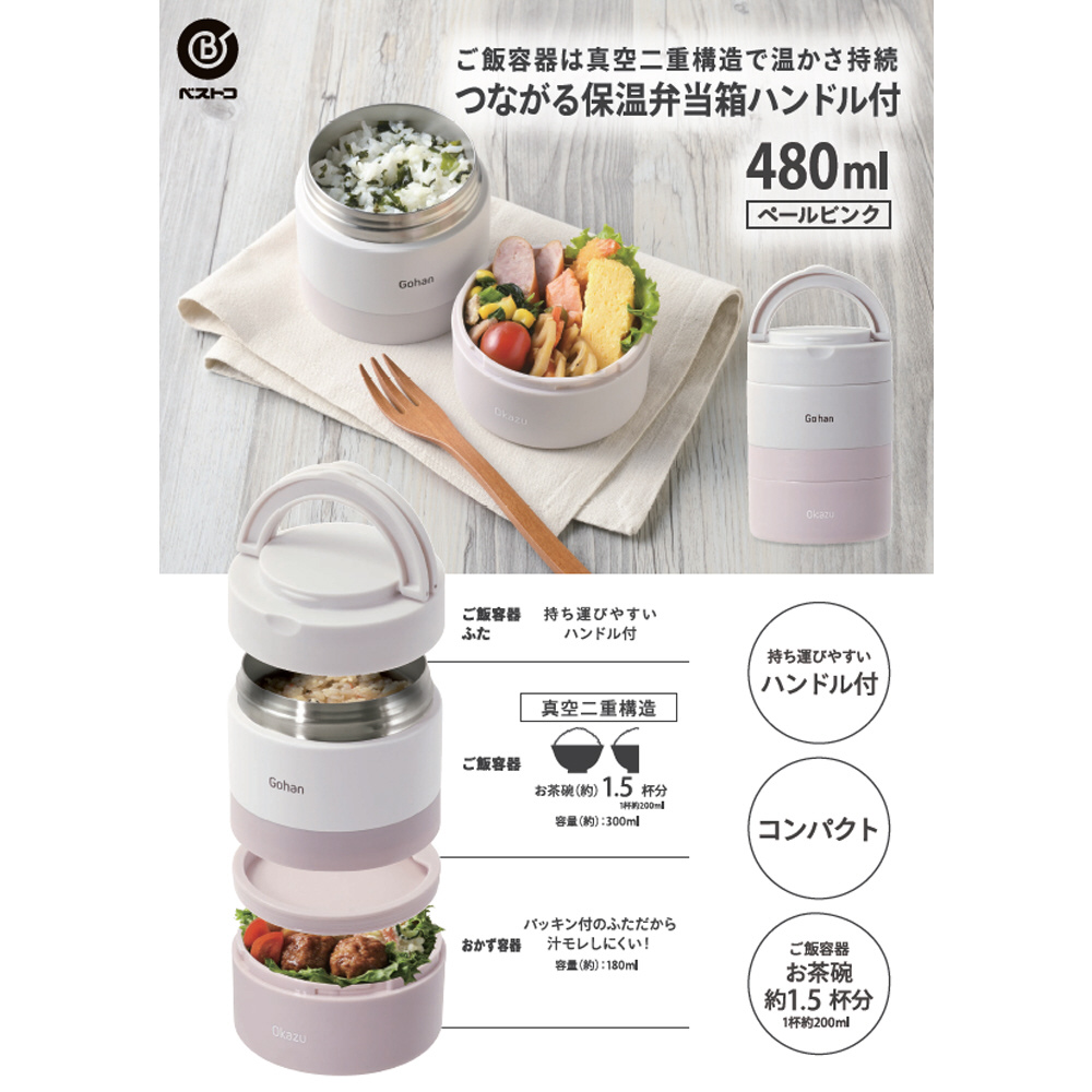 弁当箱 2段 ハンドル付き 480ml ペールピンク 保温 NQ-213