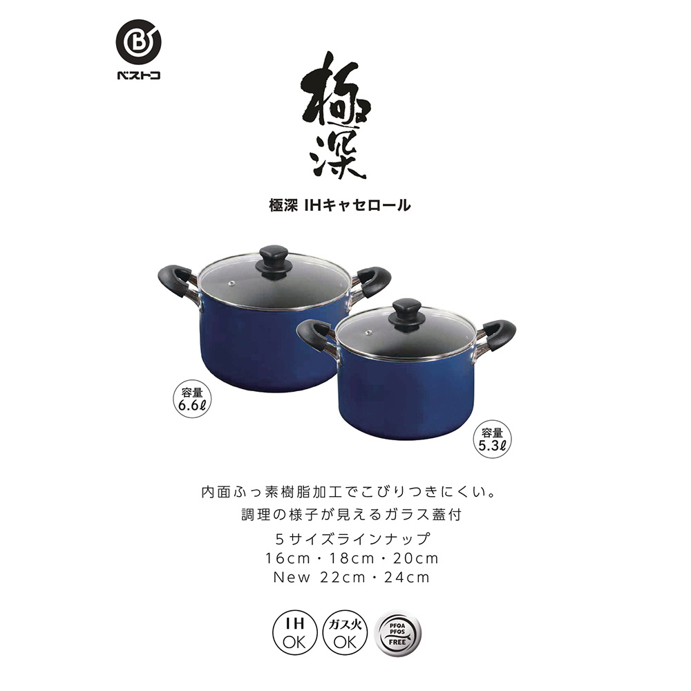 両手鍋 24cm キャセロール IH ガス火対応 ブルー 極深 NQ-0265