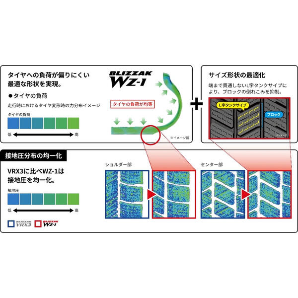 ●WZ MotionラインBLIZZAKの技術力で高水準に対応。より均一に接地することであらゆる路面に対してタイヤの性能を高次元で発揮。