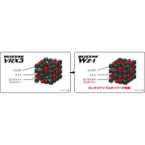 VRX3に比べWZ-1はタイヤのやわらかさに寄与するロングステイブルポリマーの配合量を増やすことで、経年による性能低下を抑制。