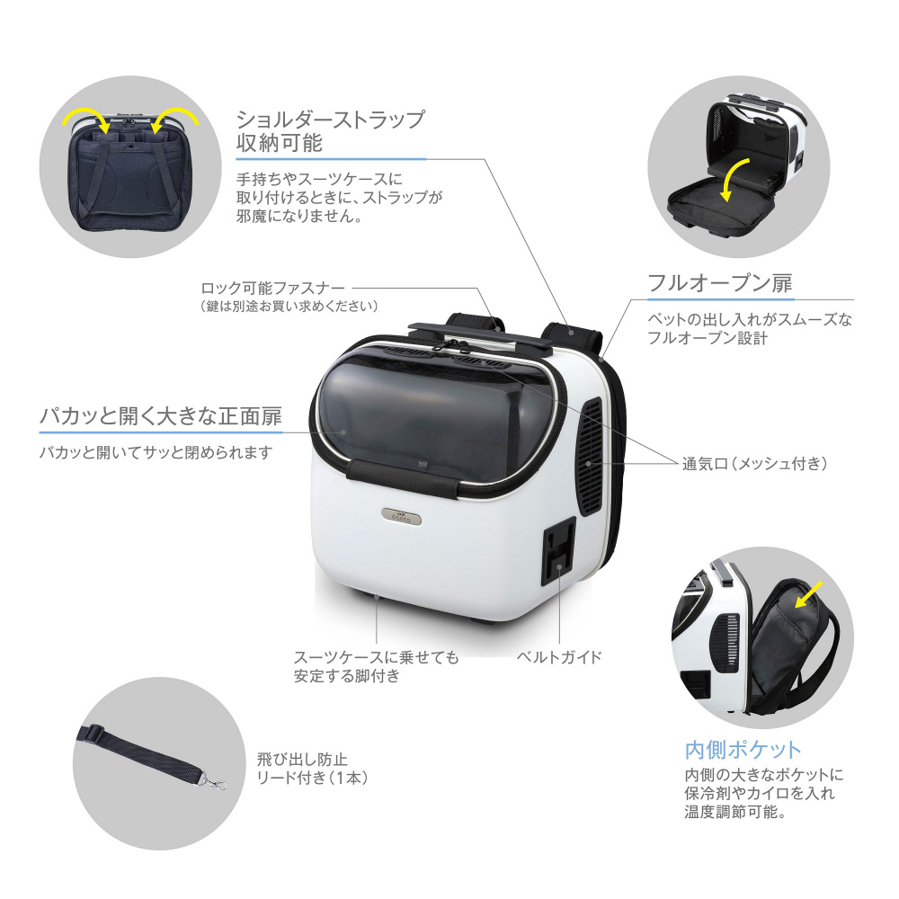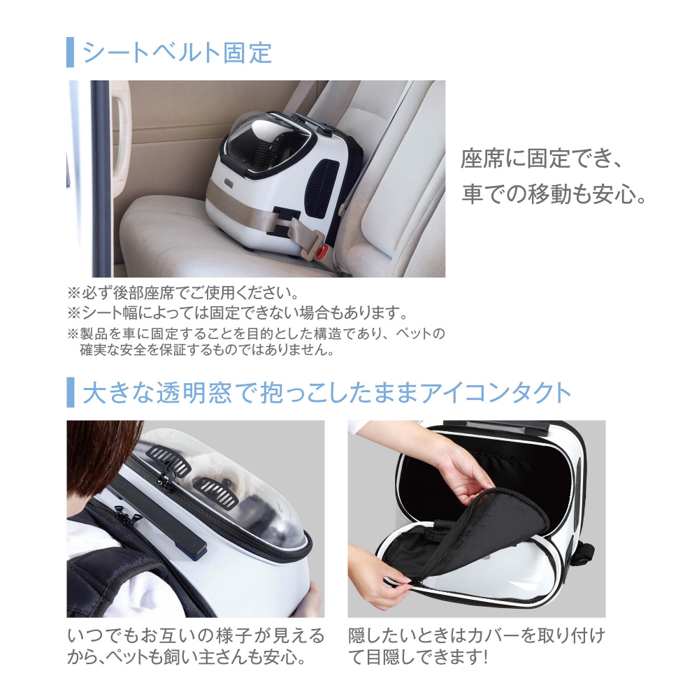 ・大きな透明窓で抱っこしたままお互いの様子が見えるのでペットも飼い主さんも安心。隠したい時はカバーと取り付けて目隠しもできます。