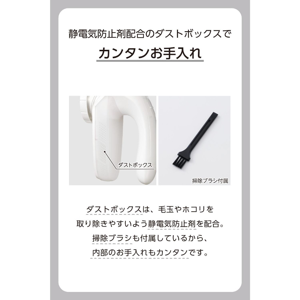ダストボックスは、毛玉やホコリを取り除きやすいよう静電気防止剤を配合しています。掃除ブラシも付属しているから、内部のお手入れもカンタンです。