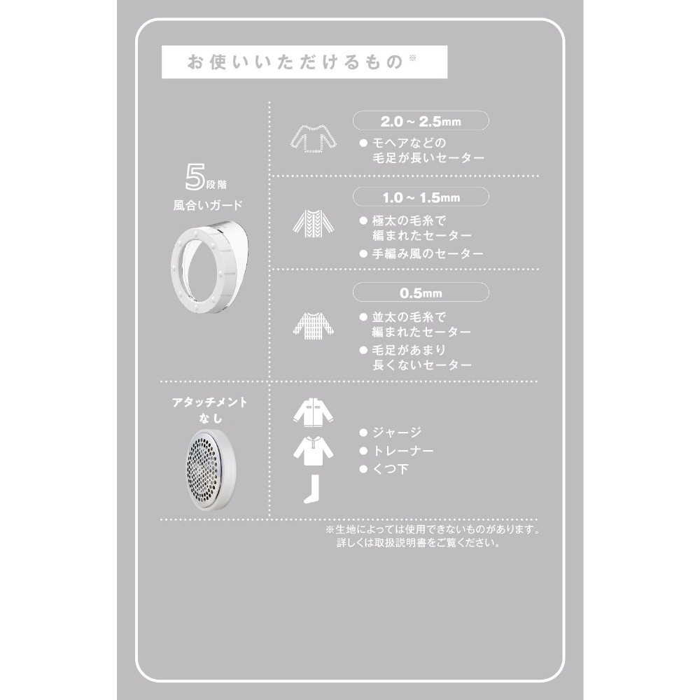 風合いガードは5段階で調整できて、仕上がりを0.5mm〜2.5mmまで0.5mmごとに変えられます。生地に応じて残したい毛足の長さを変えられるから、気になる部分だけをカットしてきれいな仕上がりに。