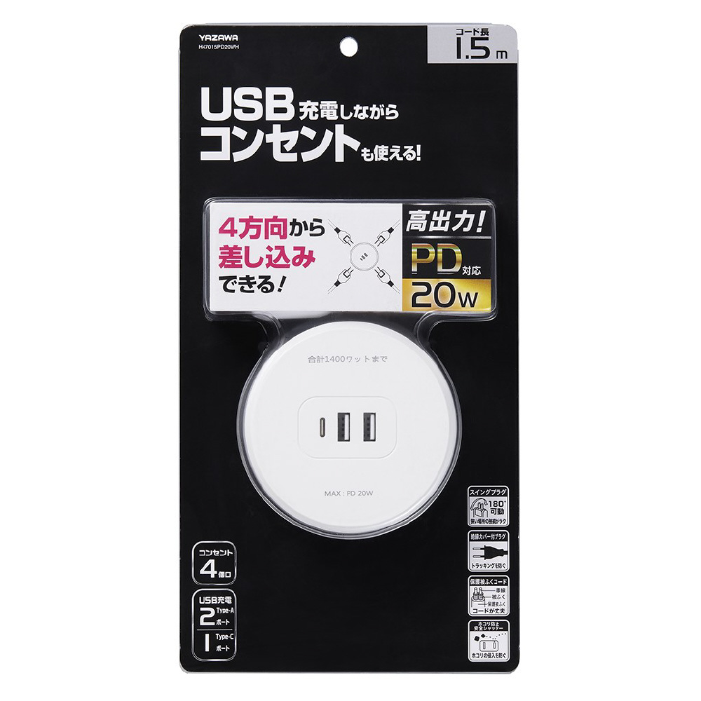 丸型タップ4個口PD20W1.5m 白 H47015PD20WH 高出力PD対応 20W USBポート Type-A×2、Type-C×1 [1.5m /4個口 /スイッチ無 /3ポート]