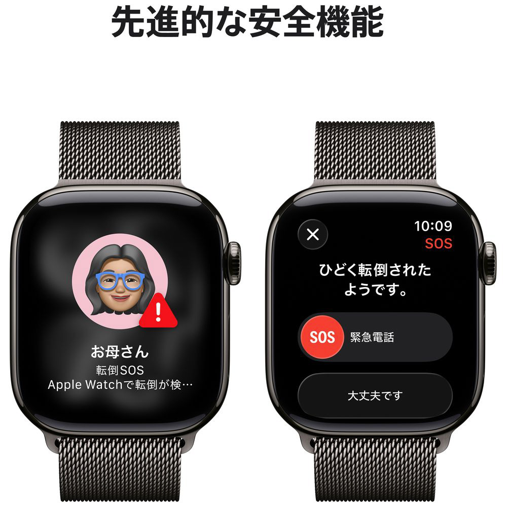 あなたが転倒した時や自動車で重大な衝突事故に遭った時に、Series 11がそれを検知。緊急通報サービスへの救助の要請と、あなたが事前に設定した緊急連絡先への連絡を自動でサポートします。到着確認機能は、あなたが目的地に到着したことを大切な人に自動で通知します。
