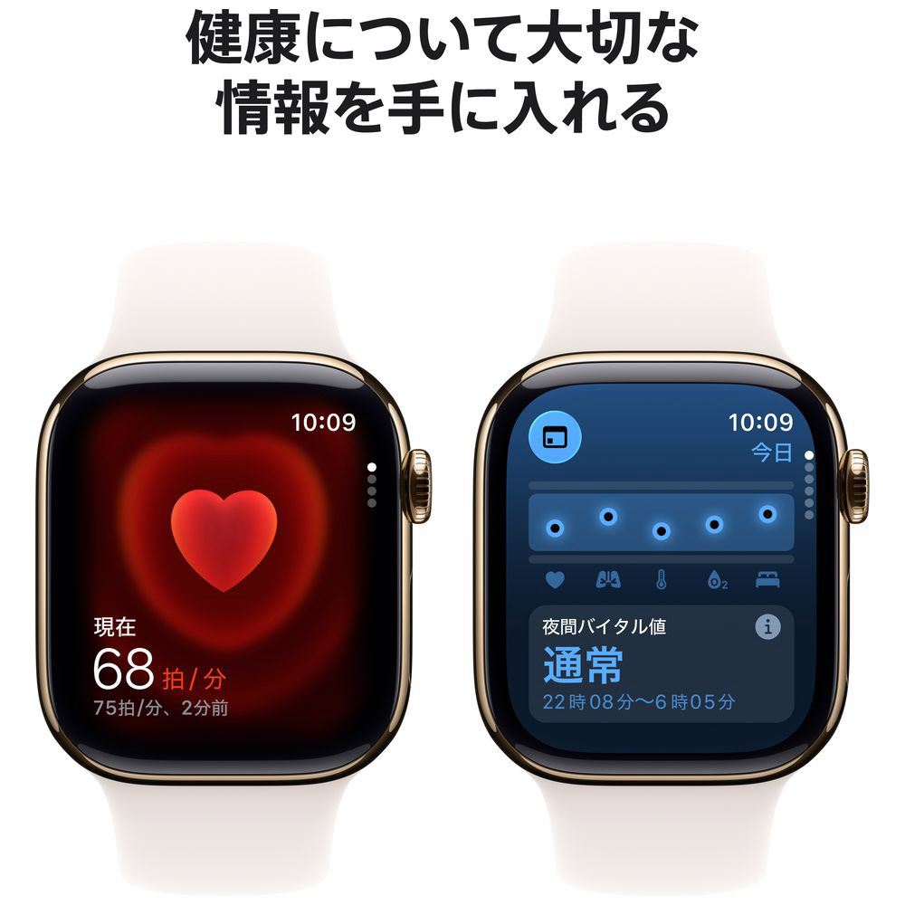 いつでも心電図を記録する。高心拍数と低心拍数、不規則な心拍リズム、睡眠時無呼吸の兆候が検出された場合に通知を受け取る。バイタルアプリで夜間の健康指標を確認する。あなたの体に取り込まれた酸素のレベルをチェックすることもできます。