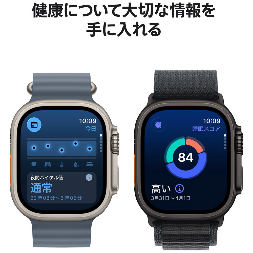 Apple Watch Ultra 3、登場。衛星通信機能1。約2日間使えるバッテリー。Apple Watch史上最も大きく、最も明るいディスプレイ。先進的な計測方法。2周波GPS。高心拍数と低心拍数の通知など、健康を理解するための重要な情報も届けます。スポーツと冒険のための究極の腕時計です。