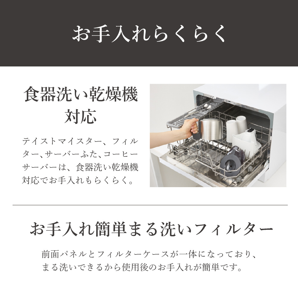 テイストマイスター、フィルター、サーバーふた、コーヒーサーバーは、食器洗い乾燥機対応でお手入れもらくらく。