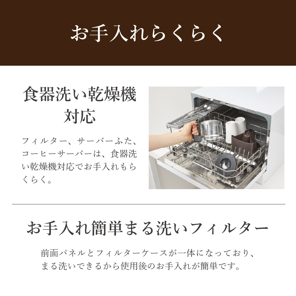フィルター、サーバーふた、コーヒーサーバーは、食器洗い乾燥機対応でお手入れもらくらく。