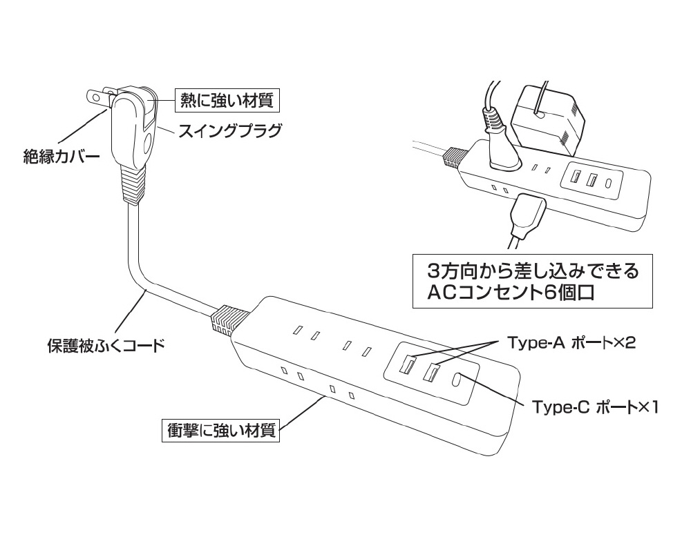 ●180度動くスイングプラグ、よじれにくく丈夫な保護被ふくコードを使用しています。