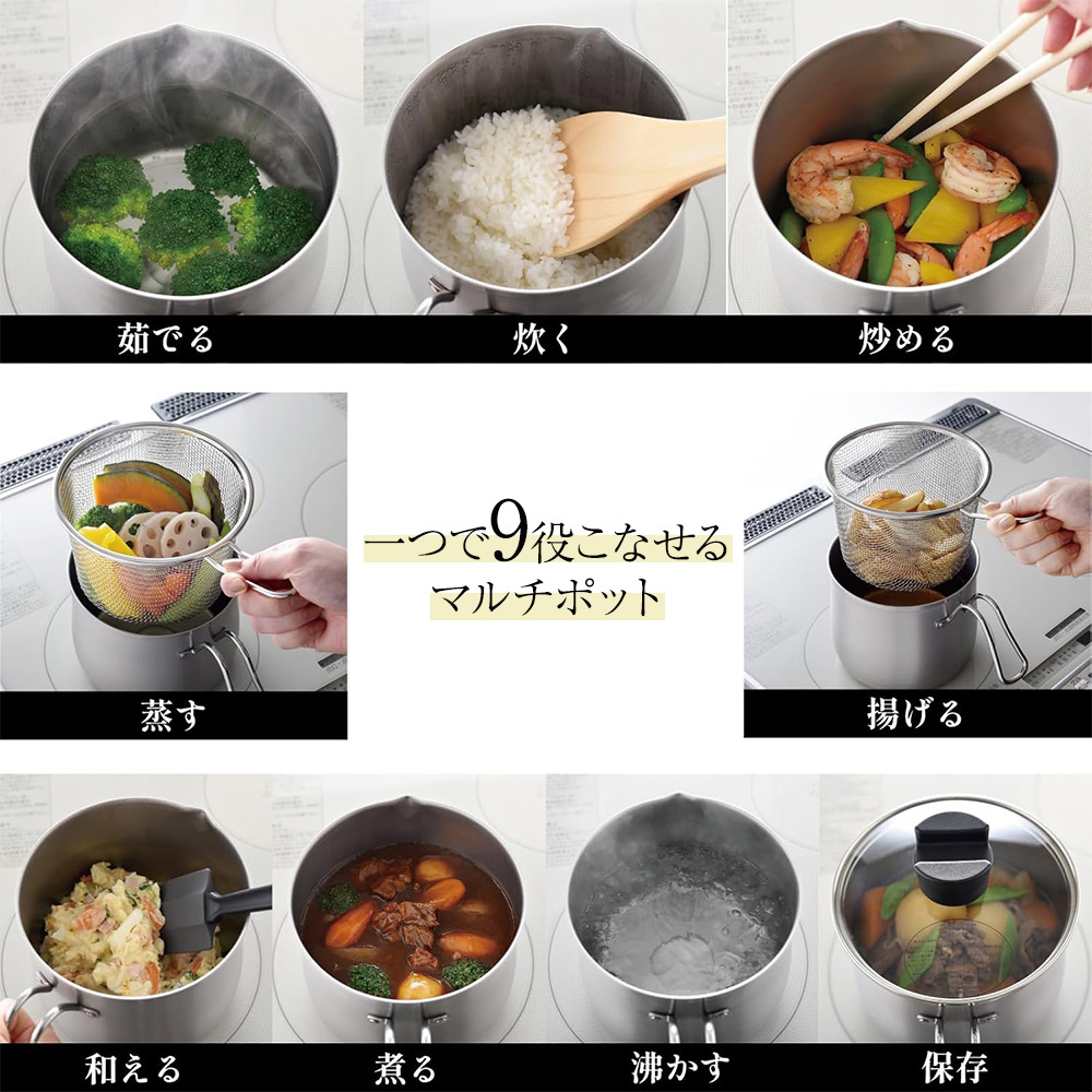 揚げ物から蒸し料理まで9役こなせるマルチポットのオリジナル4点セット。