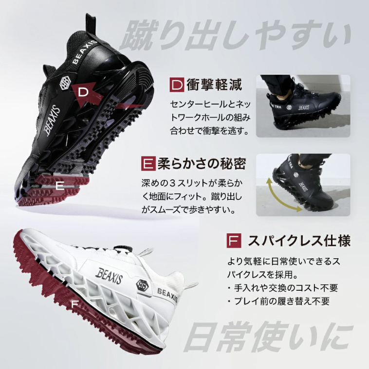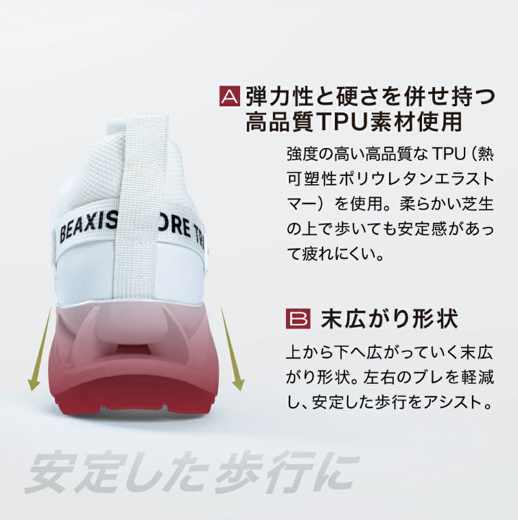 改良された特許取得済インソールはもちろん、低重心へ導く「ちょい重」仕様で、体幹を鍛えて安定感あるフォームへ。効率が良く再現性の高いパワフルなスイングをサポートします。