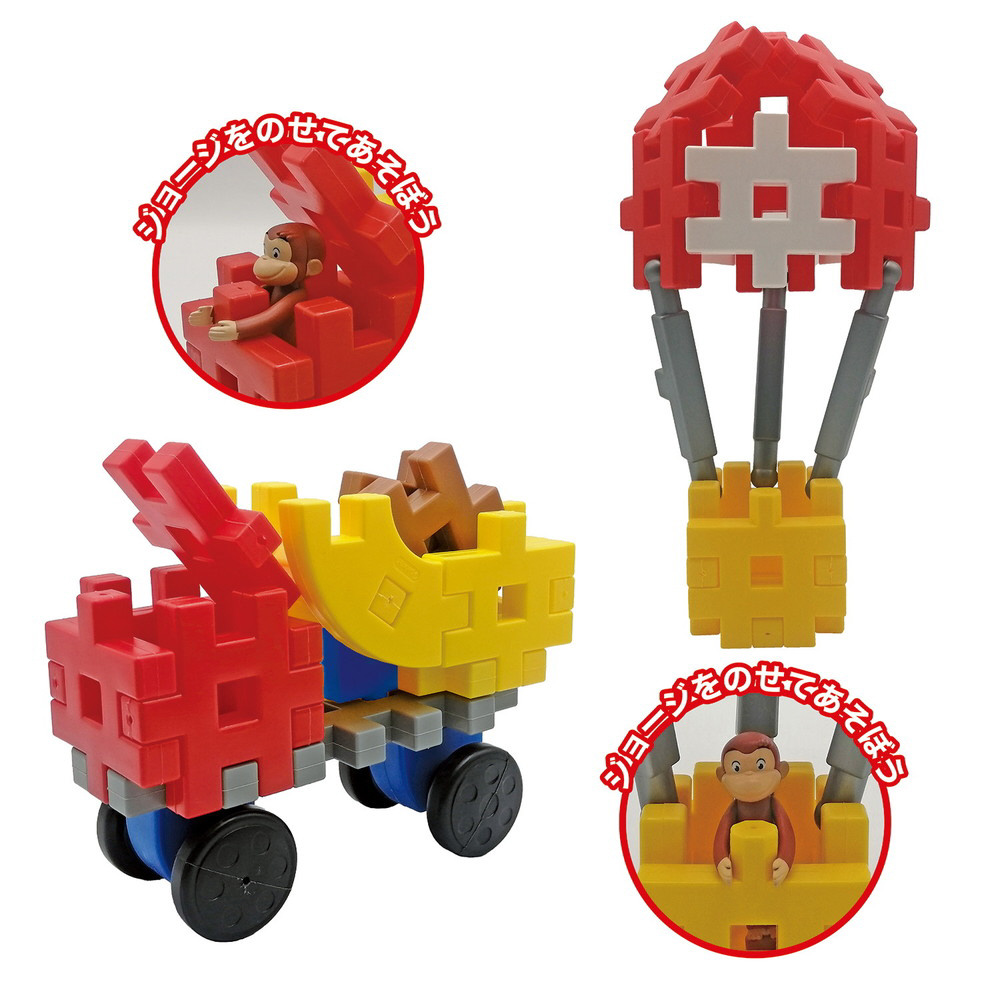 気球や別荘などをブロックで組み立てて、腕が動くジョージのフィギュアと一緒に冒険ごっこが楽しめます。
