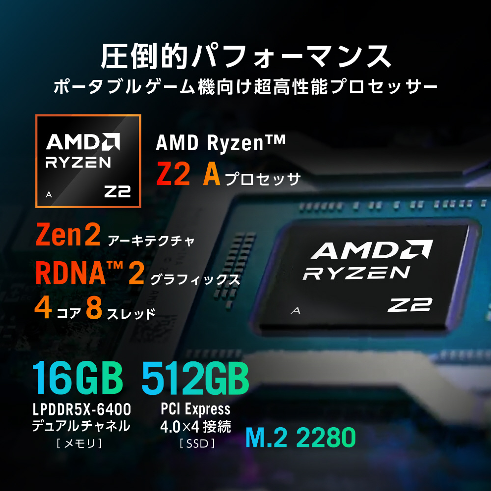 スムーズなゲームプレイ、グラフィックス性能、電力効率を優れたバランスで発揮するAMD Ryzen Z2 A プロセッサと、多くのゲームの推奨スペックを満たす16GBメモリを搭載。ゲームライブラリを気軽に外へ持ち出したいゲーマーや、ポータブルゲーミングをこれから始めたいゲーマーに最適な性能を凝縮しました。