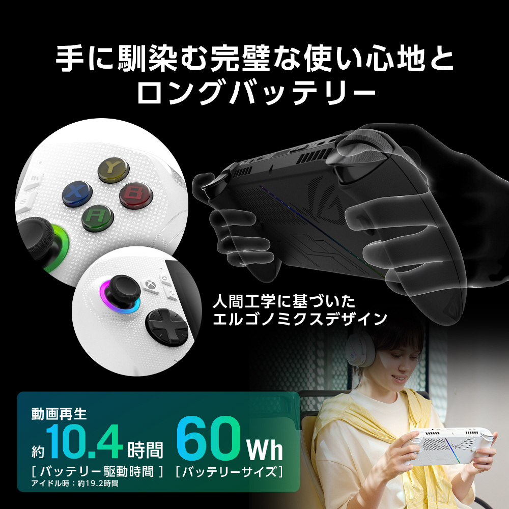 好きなゲームを、最高の環境で、心ゆくまで楽しめるROG Allyが、Xboxの協力によりさらに進化しました。高速パフォーマンス、驚異的なビジュアル、ロングライフバッテリーを実現するROGの革新的なテクノロジーと、慣れ親しまれたXboxの融合を、いつでも、どこでも、あなたの手のひらでお楽しみください。