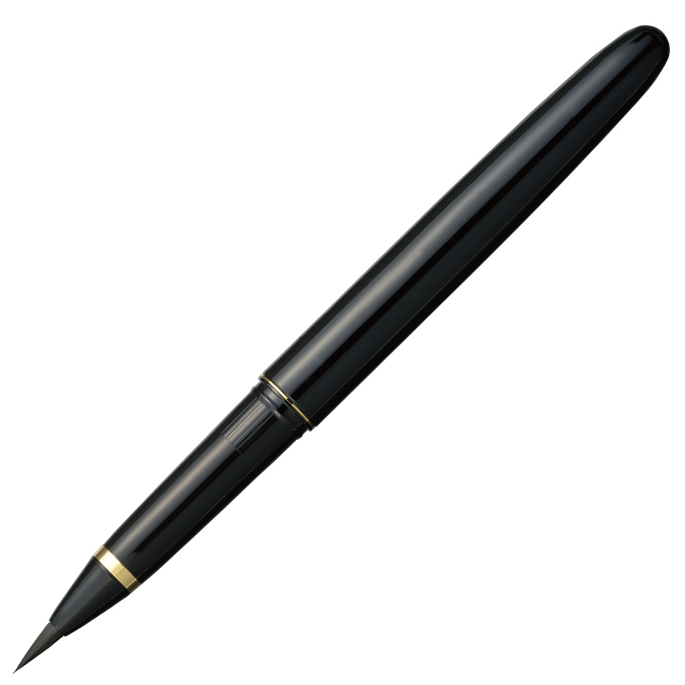 穂先のまとまりが良くイタチ毛に迫る書き味のポリエステル毛材を使用。トメ、ハネ、ハライが美しく書けて携帯にも便利な本格派筆ぺんです。