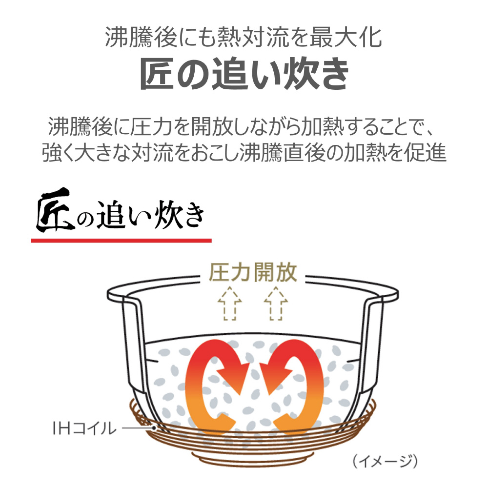 ・内釜の中を真空にし、圧力差でお米の芯までたっぷり吸水させます。しっかり水を吸ったお米は内部まで熱が伝わりα化を促進。ごはんの甘みを引き出します。