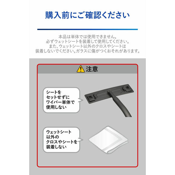 また、ウェットシート以外のクロスやシートを装着しないでください。ガラスに傷がつくおそれがあります。