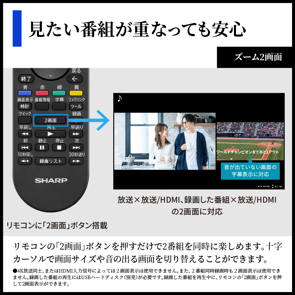 2つの番組を同時に楽しめる「ズーム2画面」搭載。大小9通りの画面サイズの組み合わせやUSBハードディスク(別売)に録画した番組の再生、音が出ていない画面の字幕表示ができます。
