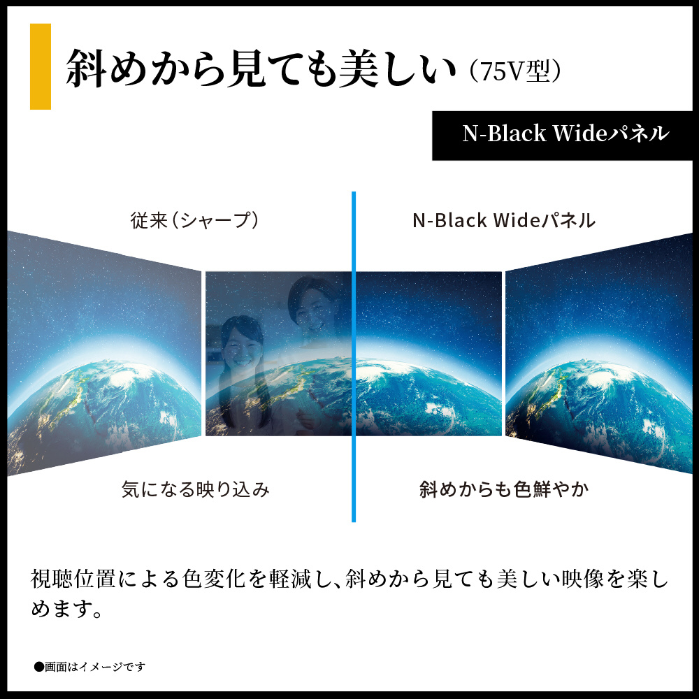 加えて、外光や照明の映り込みを抑えながら、艶やかな黒を表現する「N-BLACKパネル」を搭載。明るいお部屋でも美しい映像をお楽しみいただけます。
