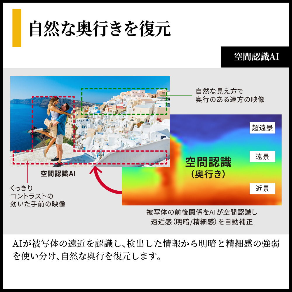 画質面では、AIが人の顔や空などのオブジェクトを検知し、色身・精細感を調整。新たに、AIが被写体の遠近を認識し、検出した情報から精細感の強弱を使い分け、その場にいるような自然な奥行きを復元する「空間認識AI」を追加し、よりリアルな映像を映し出します。