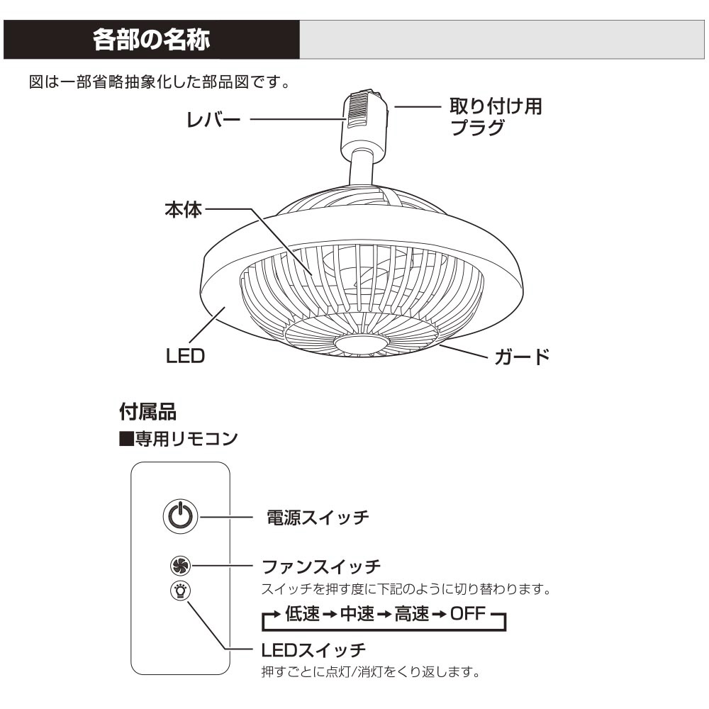 ■ ファン部:定格電圧…100V 50/60Hz、消費電力…高速回転時 6W/中速回転時 3W/低速回転時 2W