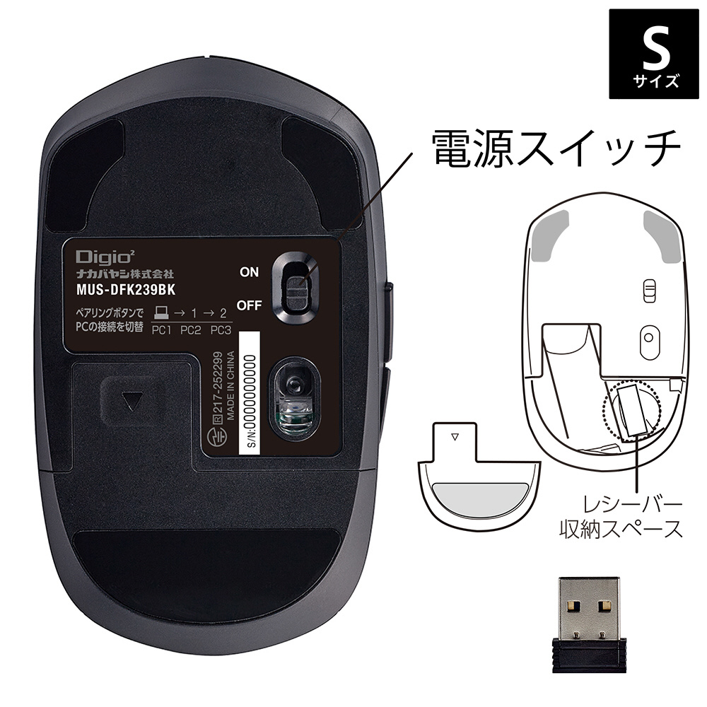 付属品 取扱説明書、単3形アルカリ乾電池1本(お試し用)、小型マイクロレシーバー(マウス 本体に収納可能W14xD19xH6mm/約2g)
