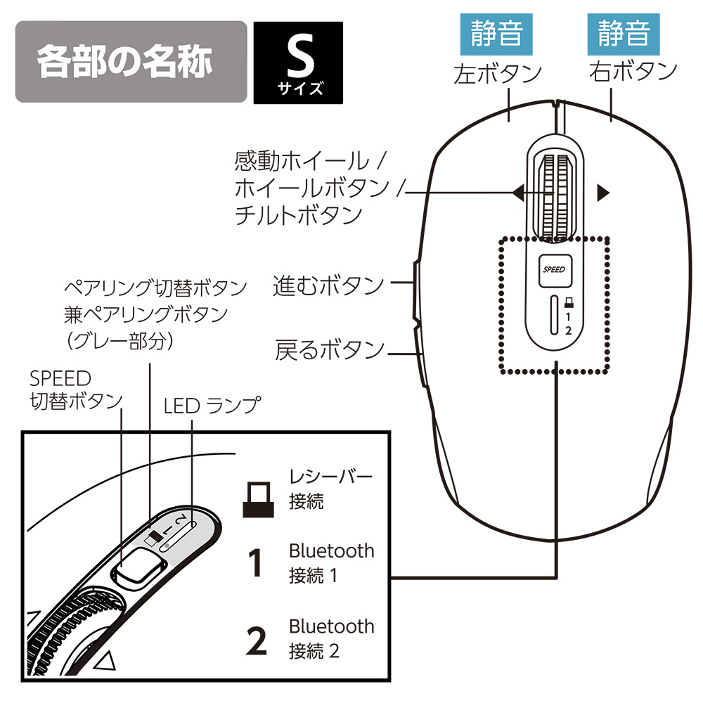 「Bluetooth・USB無線(デュアル)静音5ボタンBlueLEDマウス Sサイズ」
