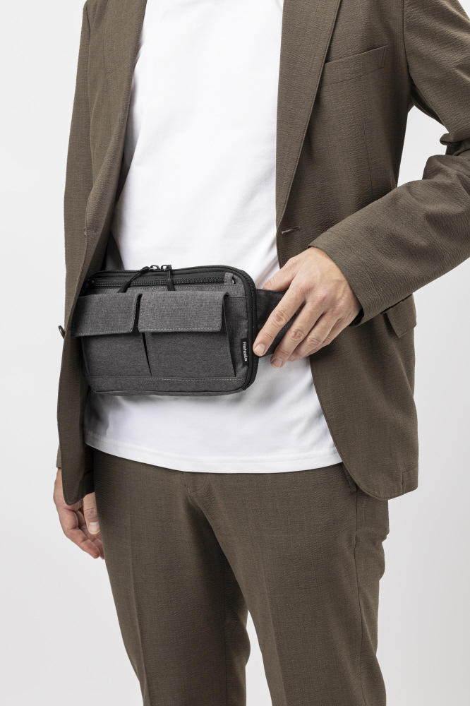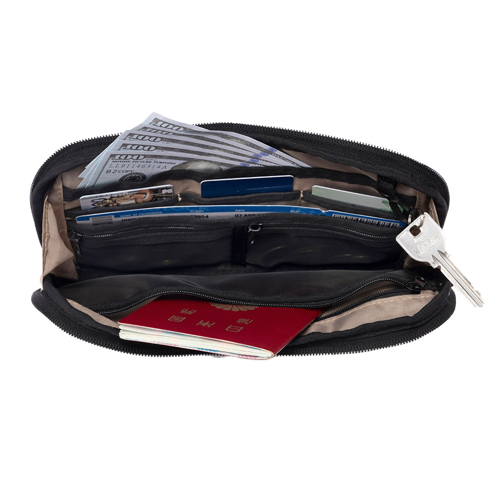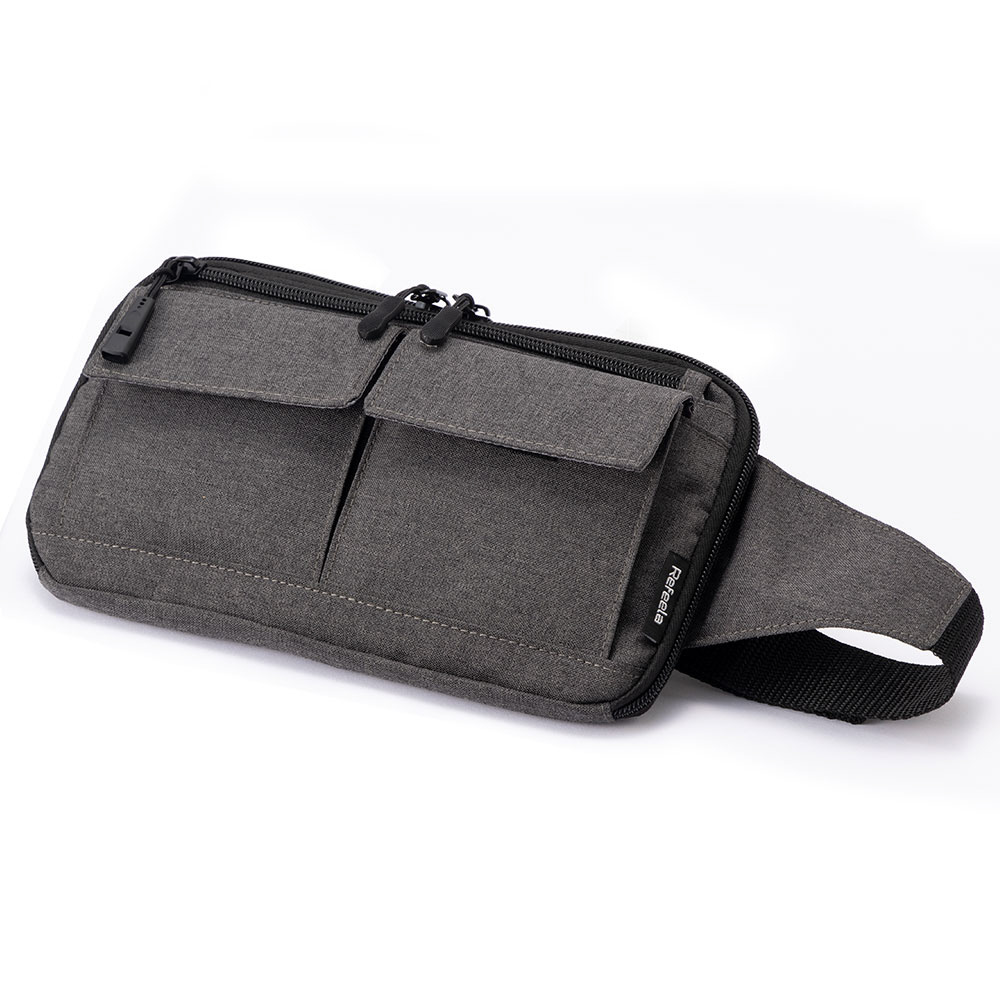 薄型デザインで貴重品をスッキリ収納可能なスキミング防止用のウエストポーチです。