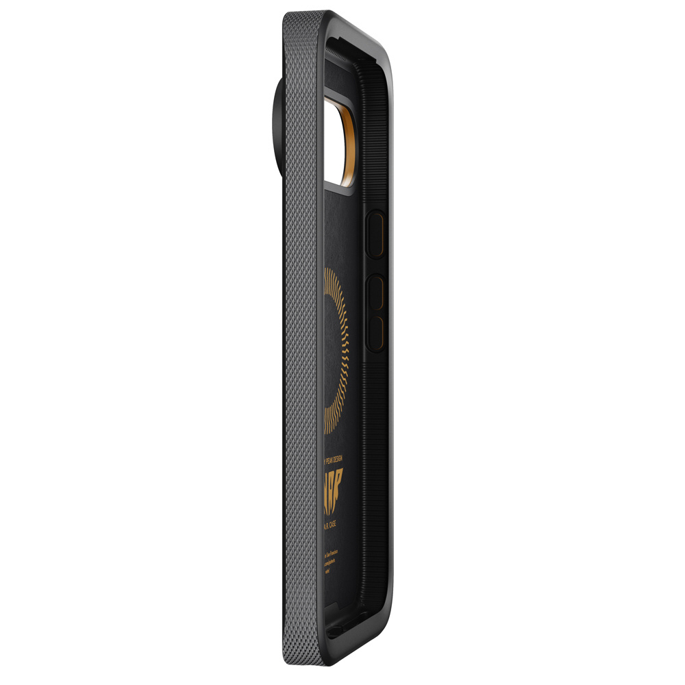 100%リサイクルのポリカーボネートを採用し傷や汚れに強く、衝撃吸収に優れたTPUフレームにはグリップ力を高めるローレット加工が施されています。内側は人工皮革「クラリーノ(TM)」を使用。削り出しのアルミニウム製ボタンを備え、手袋をしたままでもスマートフォンのボタン操作をスムーズに行えます。