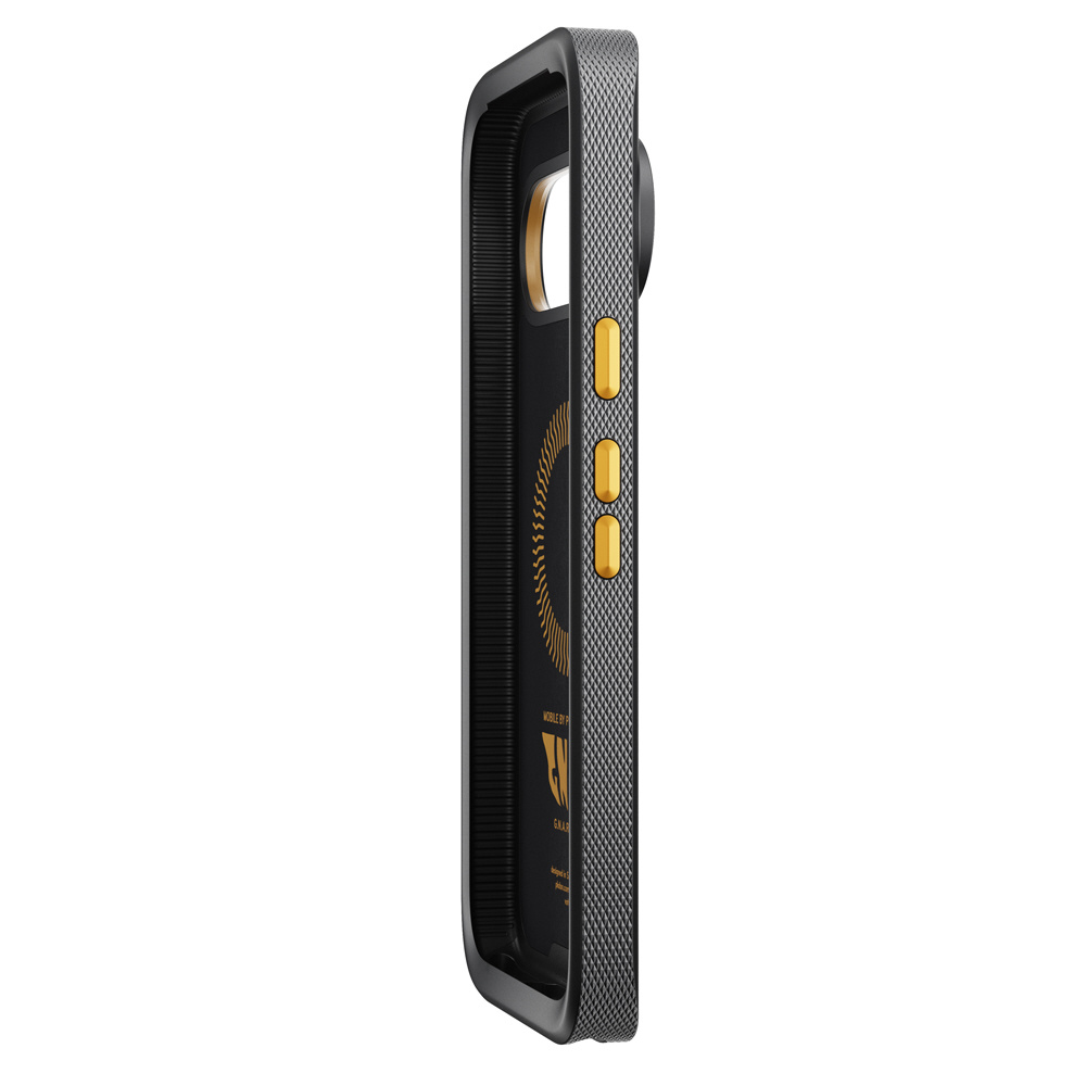 ケースの上部と下部のバンパーにより厚みを持たせ、落下時などの保護性能を強化しています。また、砂塵の多い環境や悪天候下での使用を想定し、底面にはUSB-Cポートへの埃や水分の侵入を防ぐ、取り外し可能な保護キャップを採用しています。