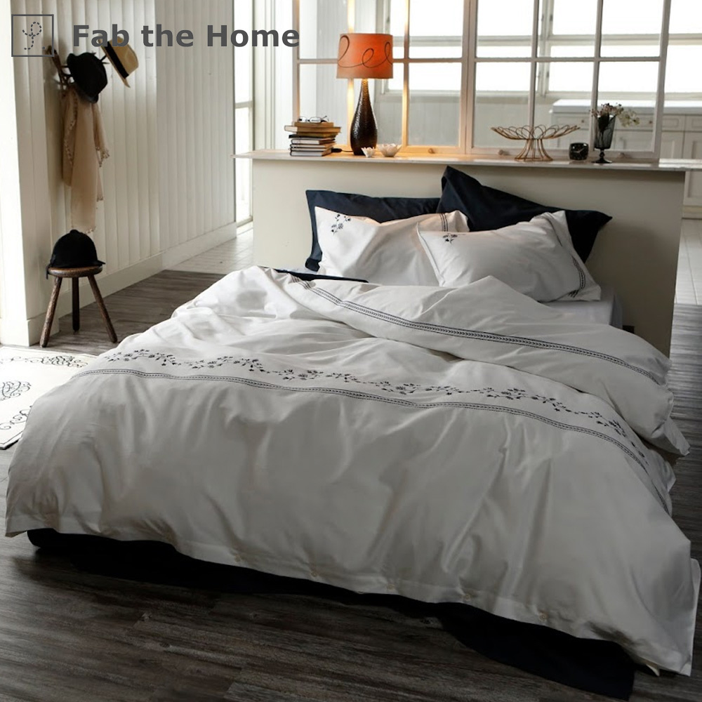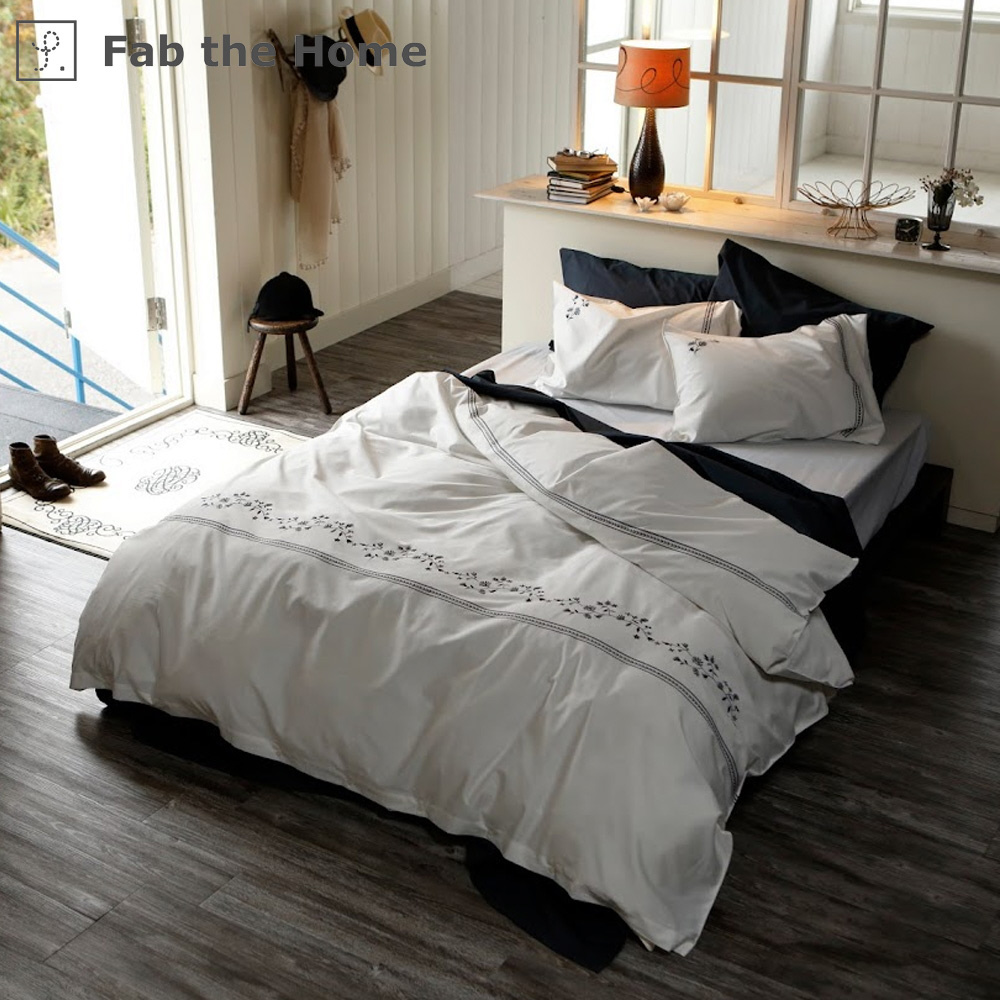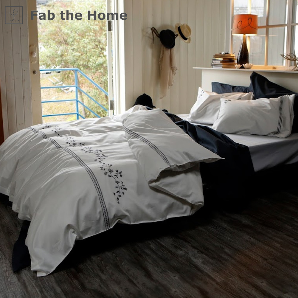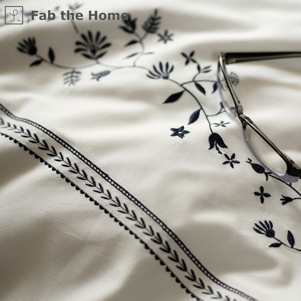 フラワーモチーフを刺繍した落ち着いた上品な色合いは甘くなりすぎず大人シックなベッドリネン