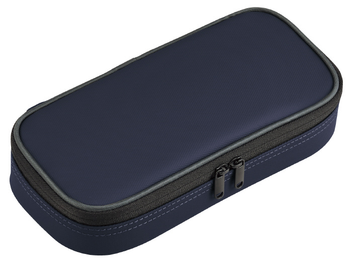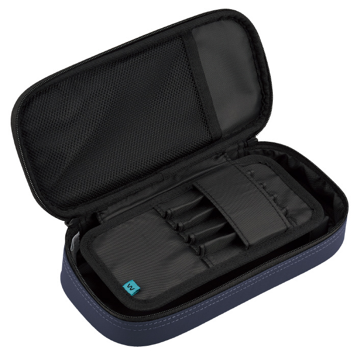 ●収容するアイテムに合わせたさまざまなサイズのポケット。フタ裏には定規などが入るメッシュポケット、ペントレー裏にはシャープ替芯2個とふせんが入る薄型ポケット。下段は消しゴムや修正テープ用の小物スペースと約15本のペンが収容できる大スペースに仕切られているため、整理しやすく取り出しやすい。●丈夫なコーティング生地にクッション材を内蔵し、周囲にパイピングを施した、耐久性と高級感にこだわったデザイン。