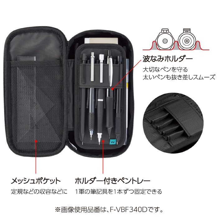 ●オリジナル設計の「波なみホルダー」は、柔軟性のある波型の仕切りが大切なペンを守り、太軸やグリップ付きのペンも抜き差ししやすい。