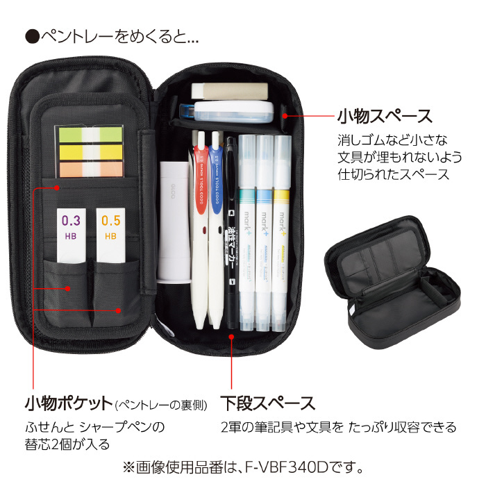 ●収容するアイテムに合わせたさまざまなサイズのポケット。フタ裏には定規などが入るメッシュポケット、ペントレー裏にはシャープ替芯2個とふせんが入る薄型ポケット。下段は消しゴムや修正テープ用の小物スペースと約15本のペンが収容できる大スペースに仕切られているため、整理しやすく取り出しやすい。●丈夫なコーティング生地にクッション材を内蔵し、周囲にパイピングを施した、耐久性と高級感にこだわったデザイン。