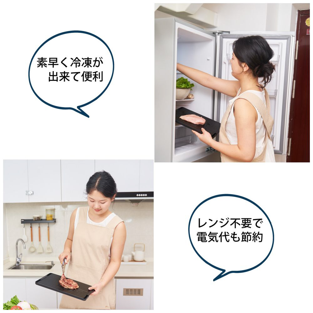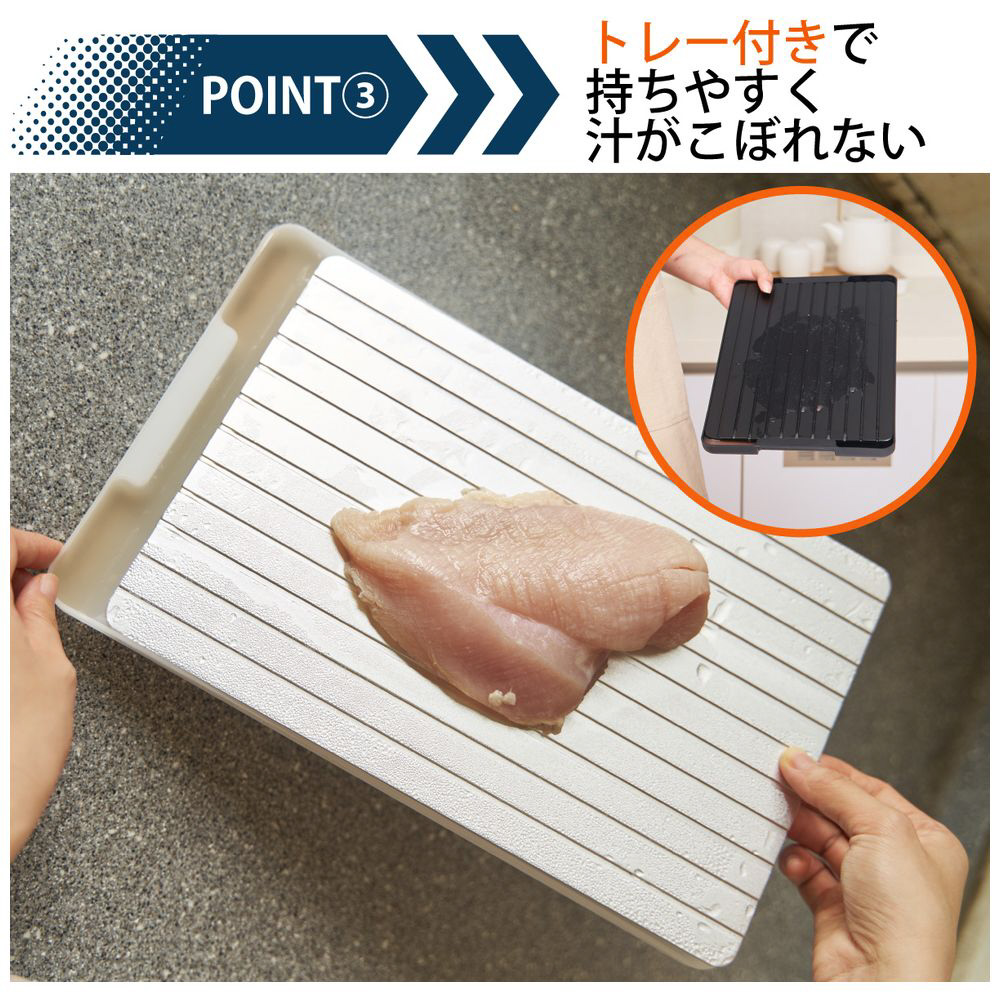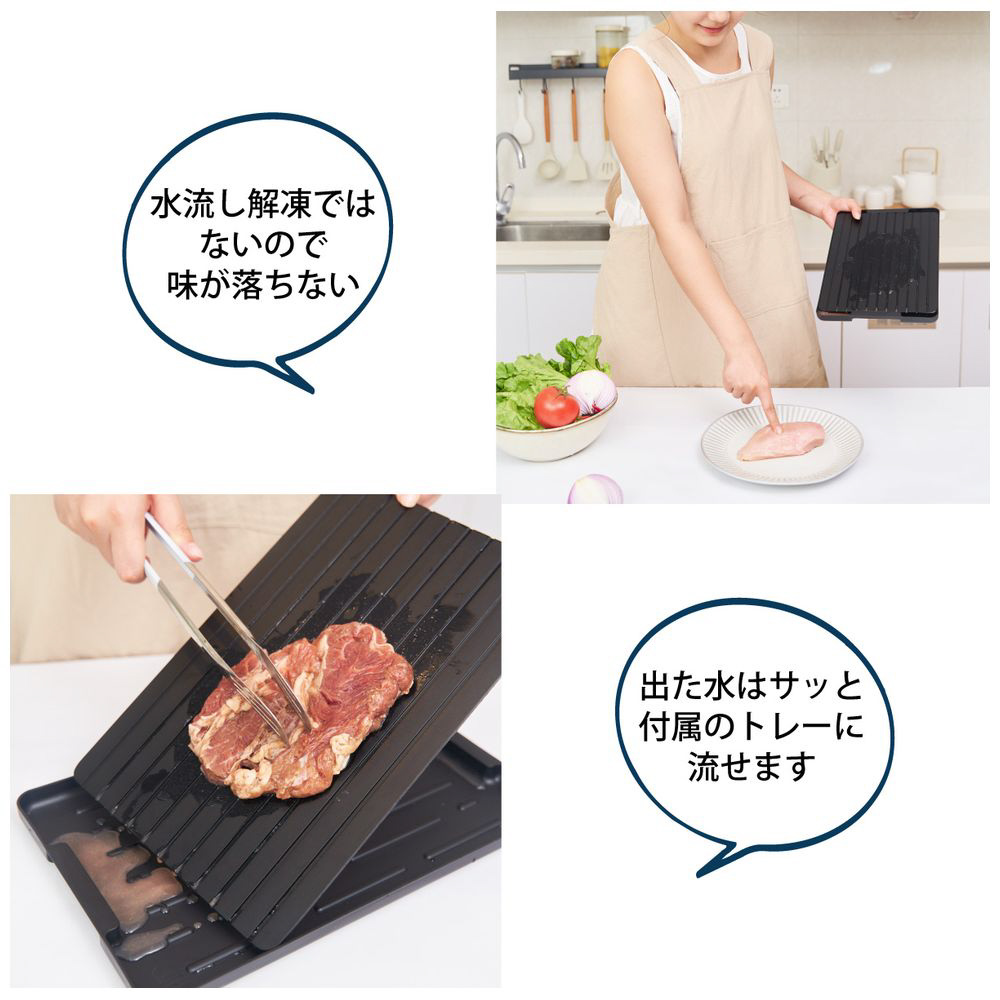 電気不要で省エネ!解凍プレートは12倍速で肉・魚・野菜を瞬時に解凍し、美味しさを逃さずキープ。出た水はサッと付属のトレーに流せて後片付けも簡単。
