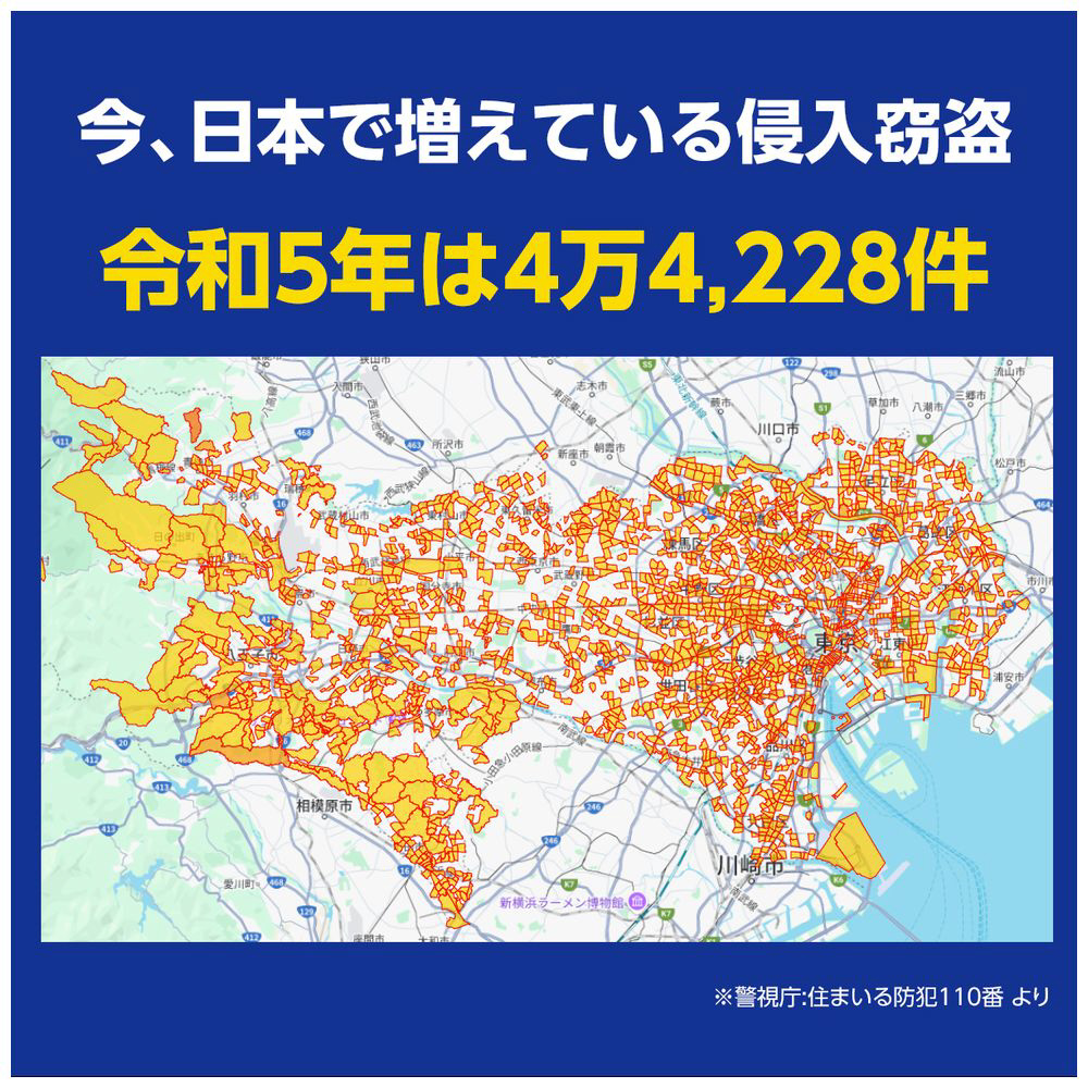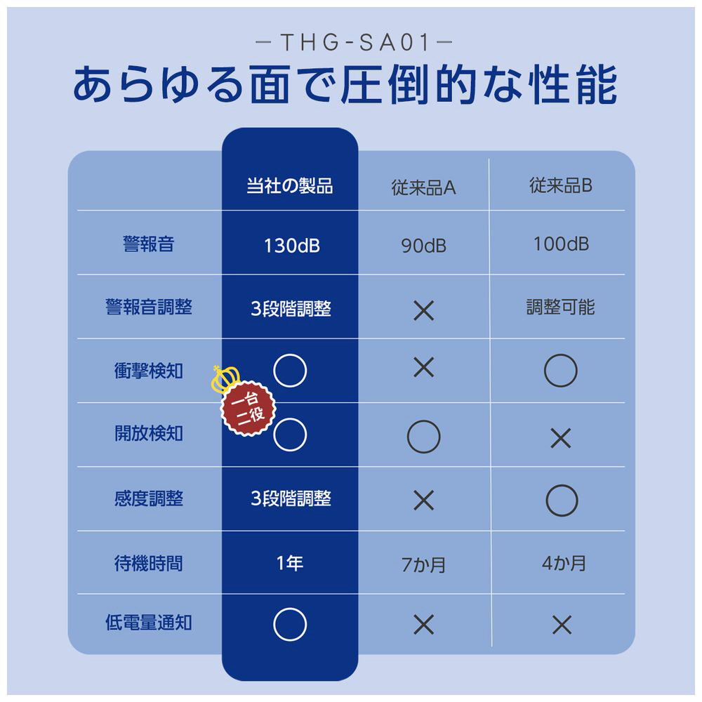 120〜130dBの大音量を30秒間発動。手動で止めるか時間経過を待つしかなく、侵入者を強力に威嚇します。