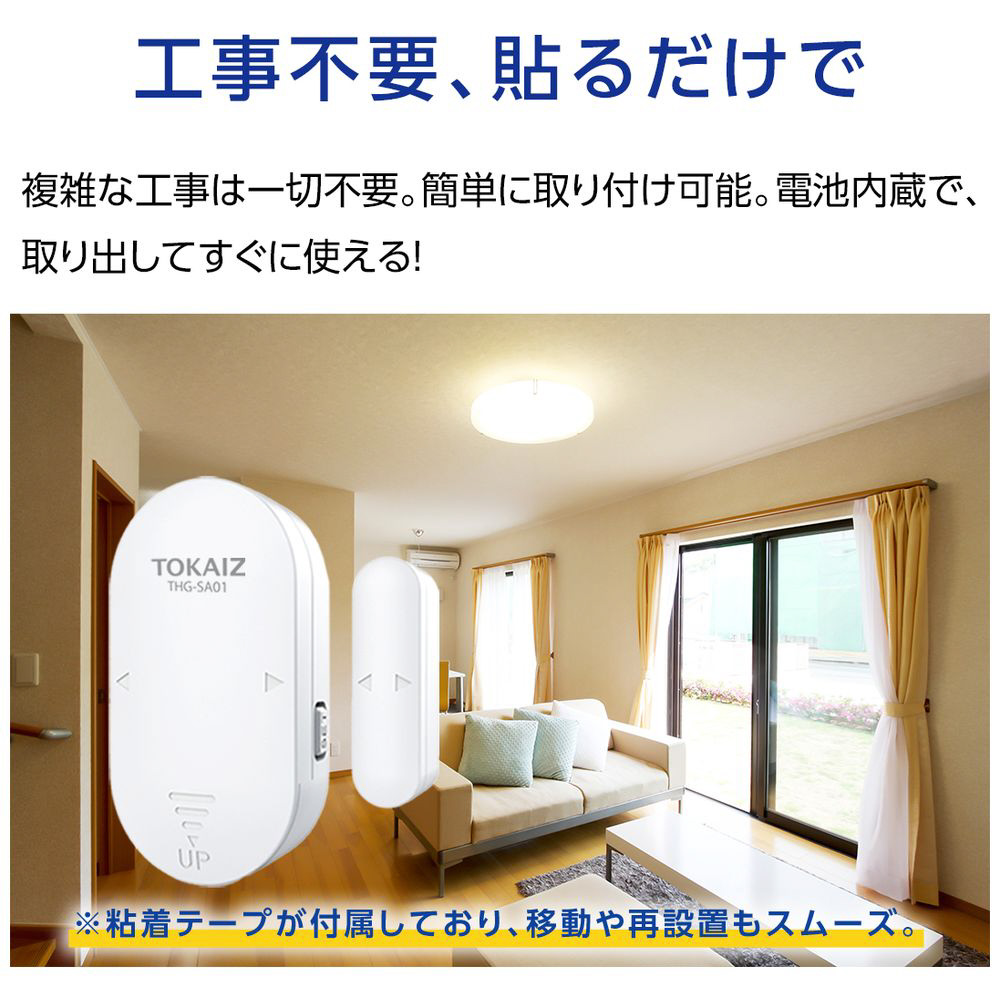 付属の粘着テープで貼るだけ。電池内蔵で、取り付け後すぐに使用可能です。