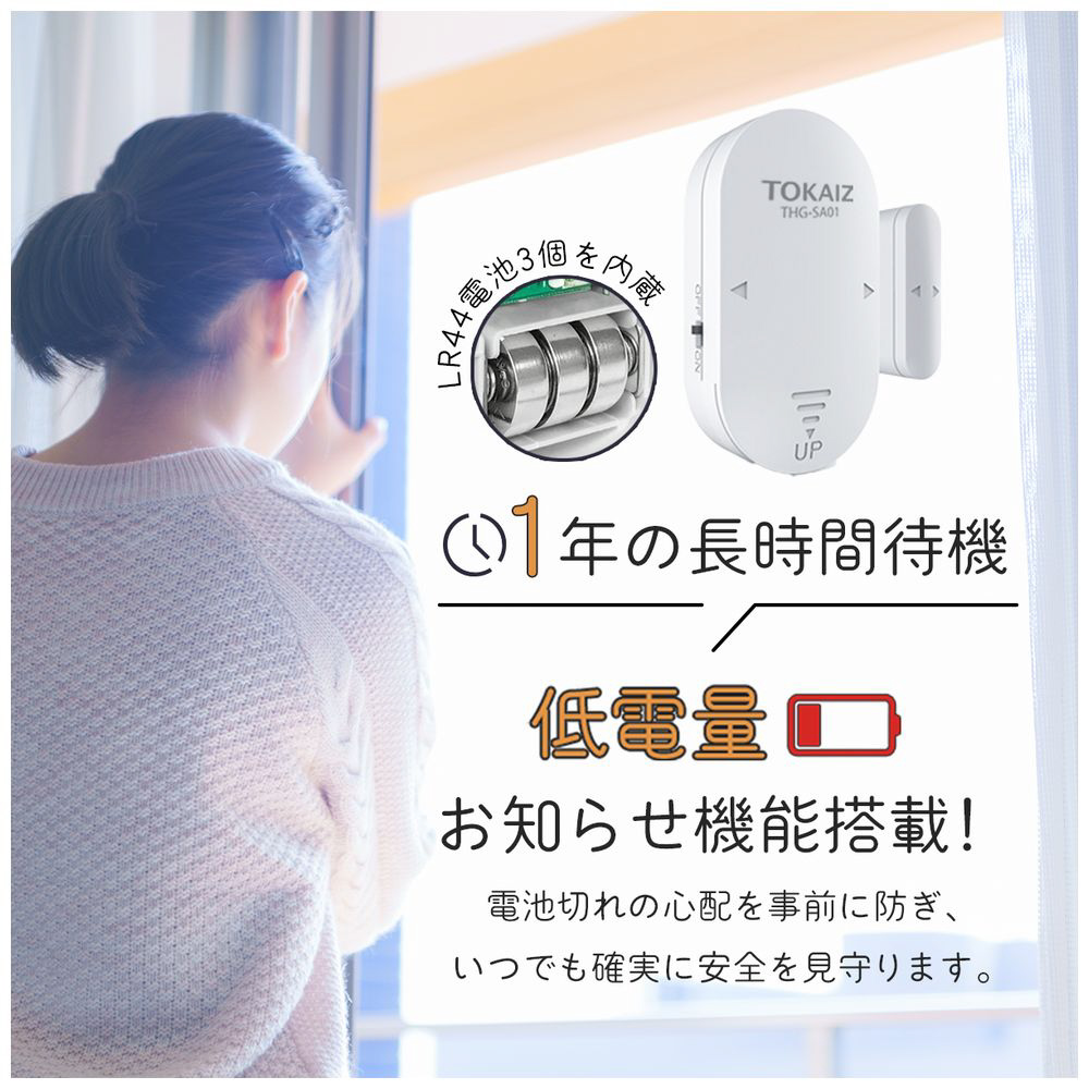 LR44電池3個で最長1年待機。電池残量が少なくなると音でお知らせし、安心が途切れません。