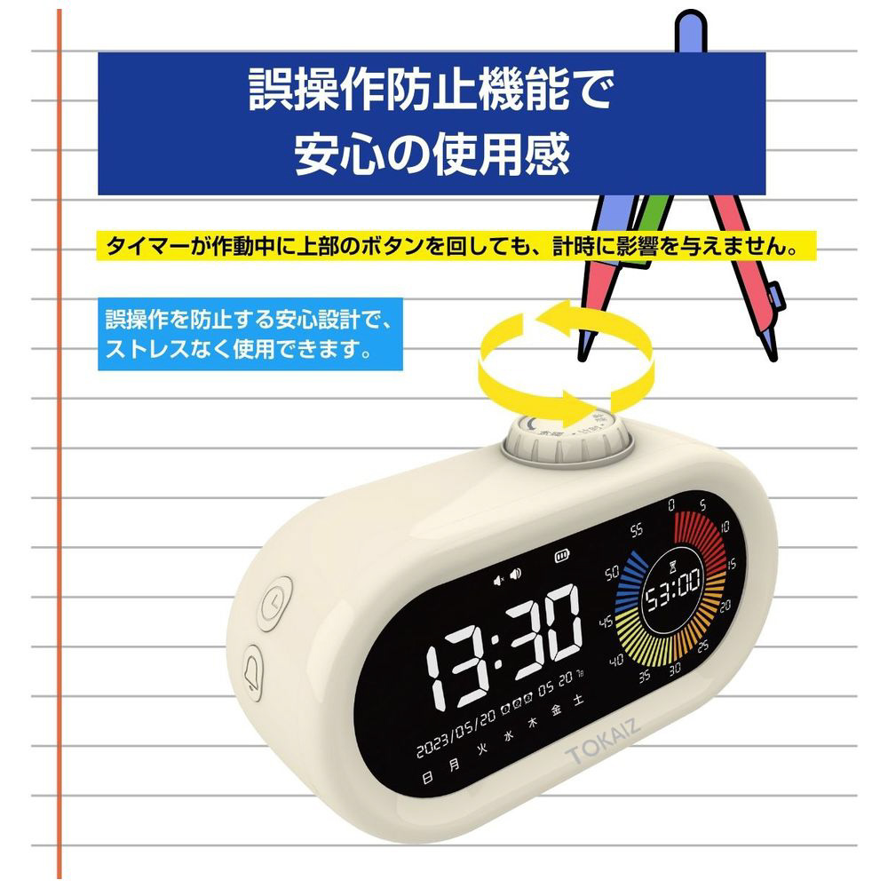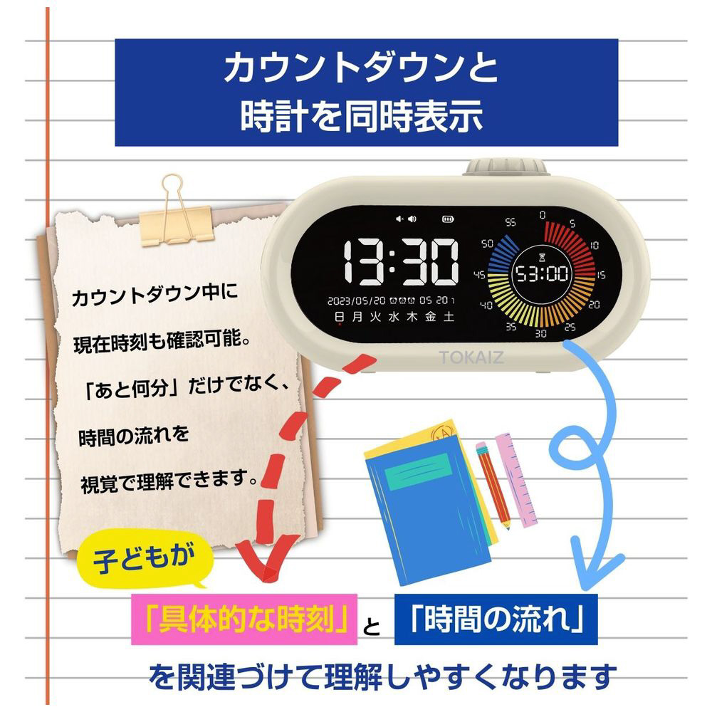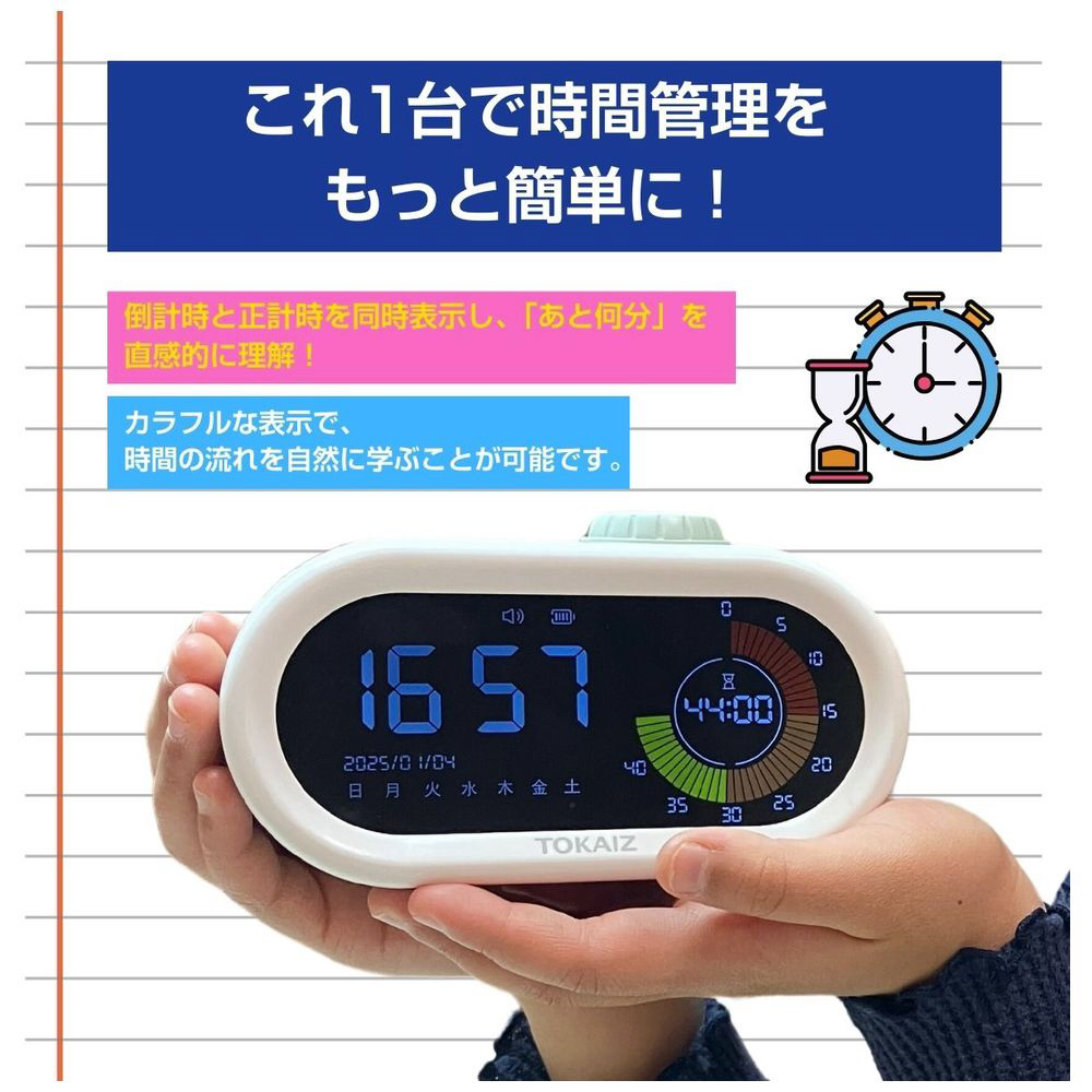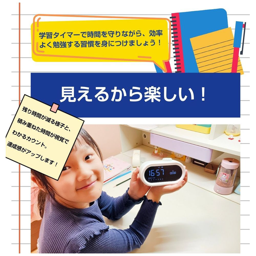 一目で分かる、管理しやすい、子どもの時間意識を育むカラフルなタイムマネージャー。勉強も生活リズムもサポートする目覚まし時計&勉強タイマー。Type-C充電式、日付・曜日表示、アラーム機能付きで小学生に最適。