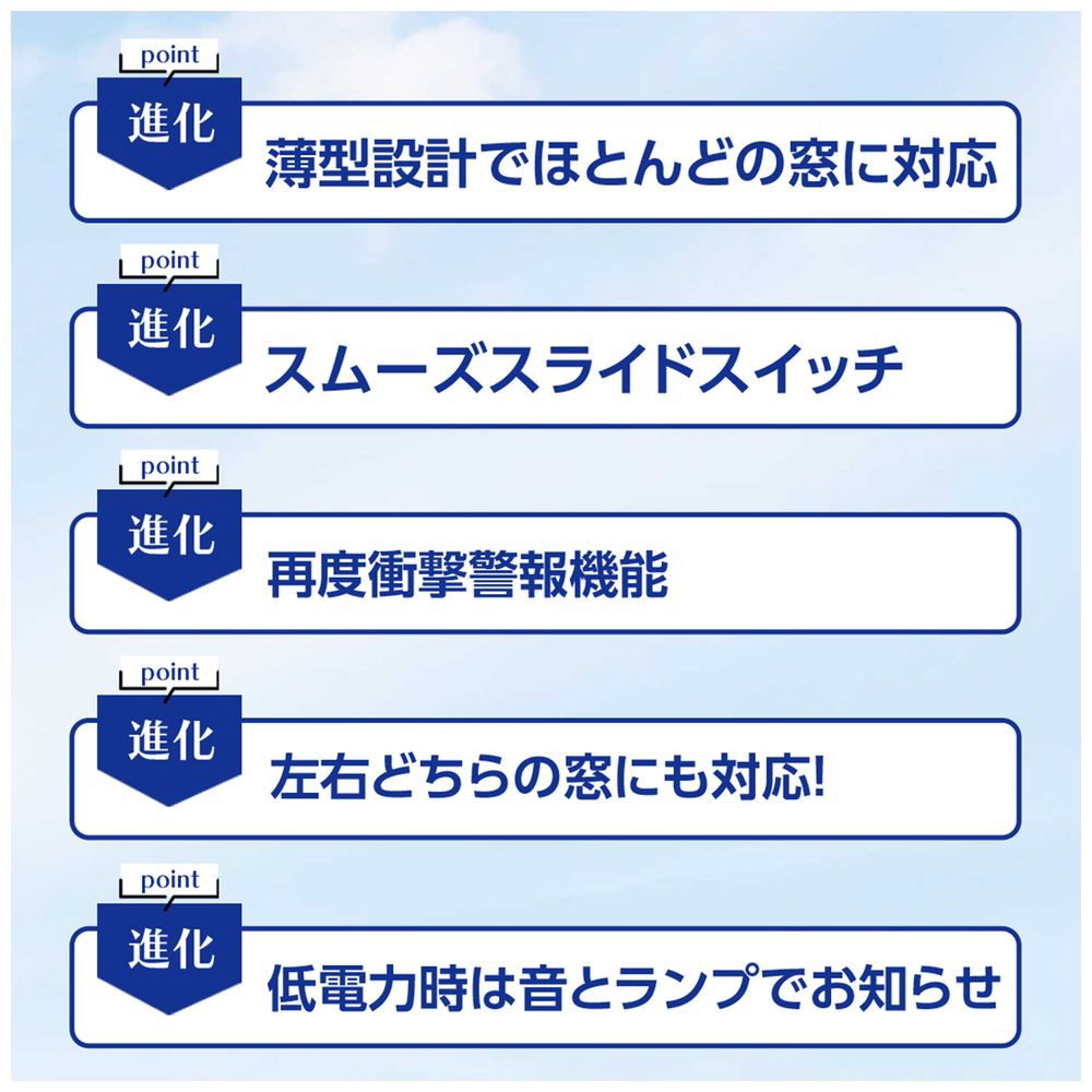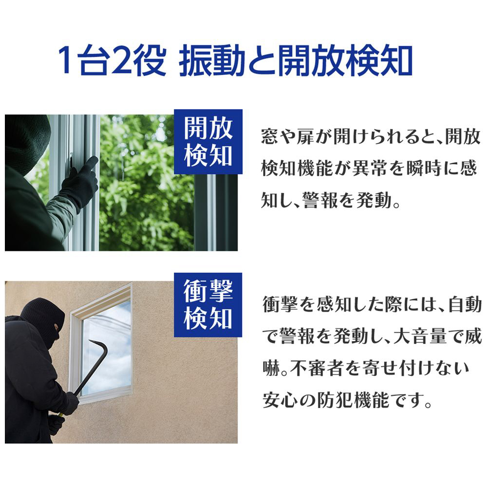 進化モデル!薄型設計でほとんどの窓に対応、空き巣対策に最適な防犯パートナー。開放検知と衝撃検知のダブル機能を搭載し、電池交換不要で1年間使える手軽さと爆音アラームで家族の安全を守ります。