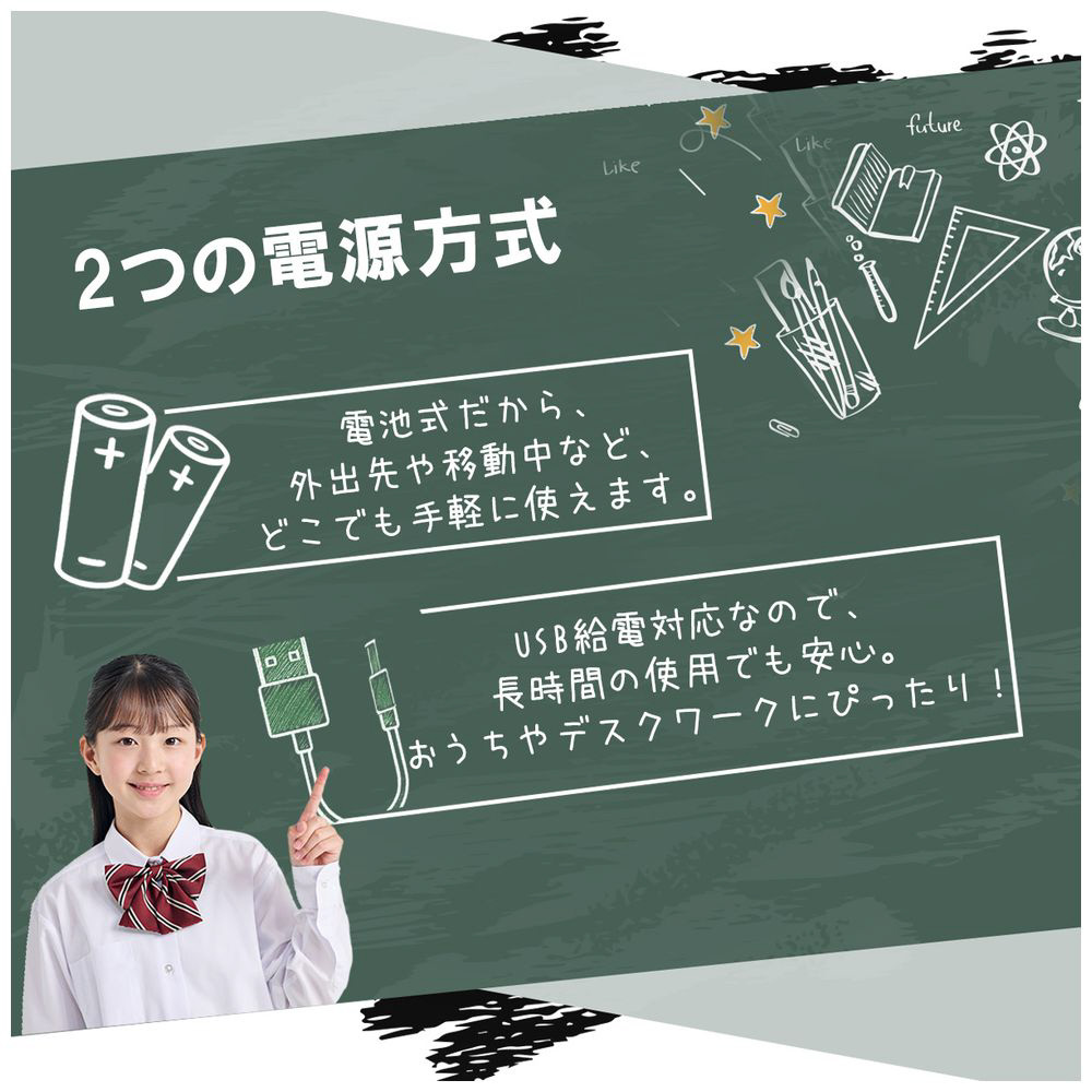 乾電池とUSB、2種類の電源に対応。家庭でもオフィスでも、使う場所を選ばず快適に使用できます。