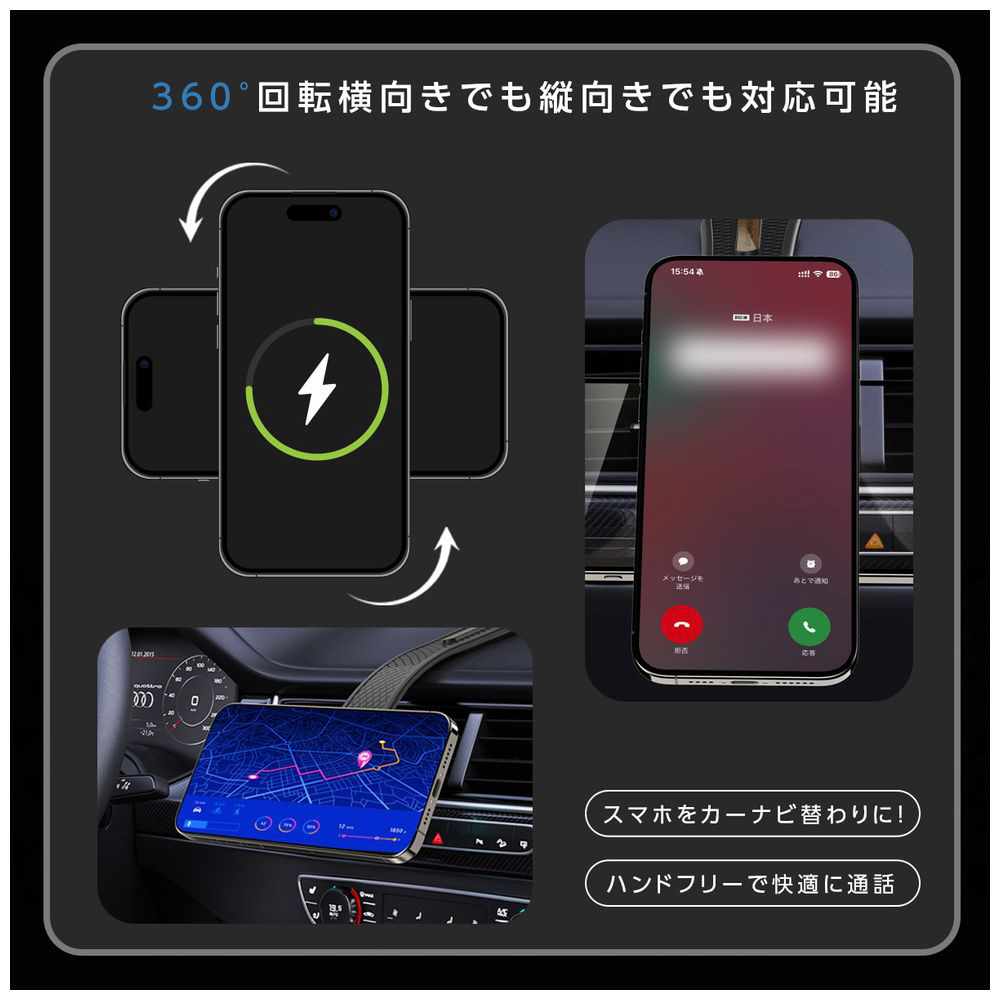 15W急速充電&52N超強力磁石でスマホを安定保持、片手操作で地図確認もスムーズ。設置場所を選ばず角度も自由に調整でき、快適なドライブをサポートします。
