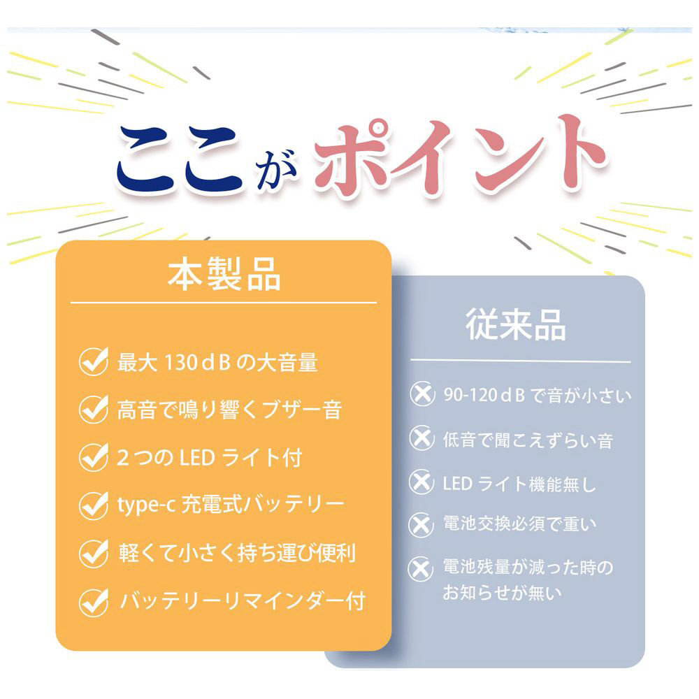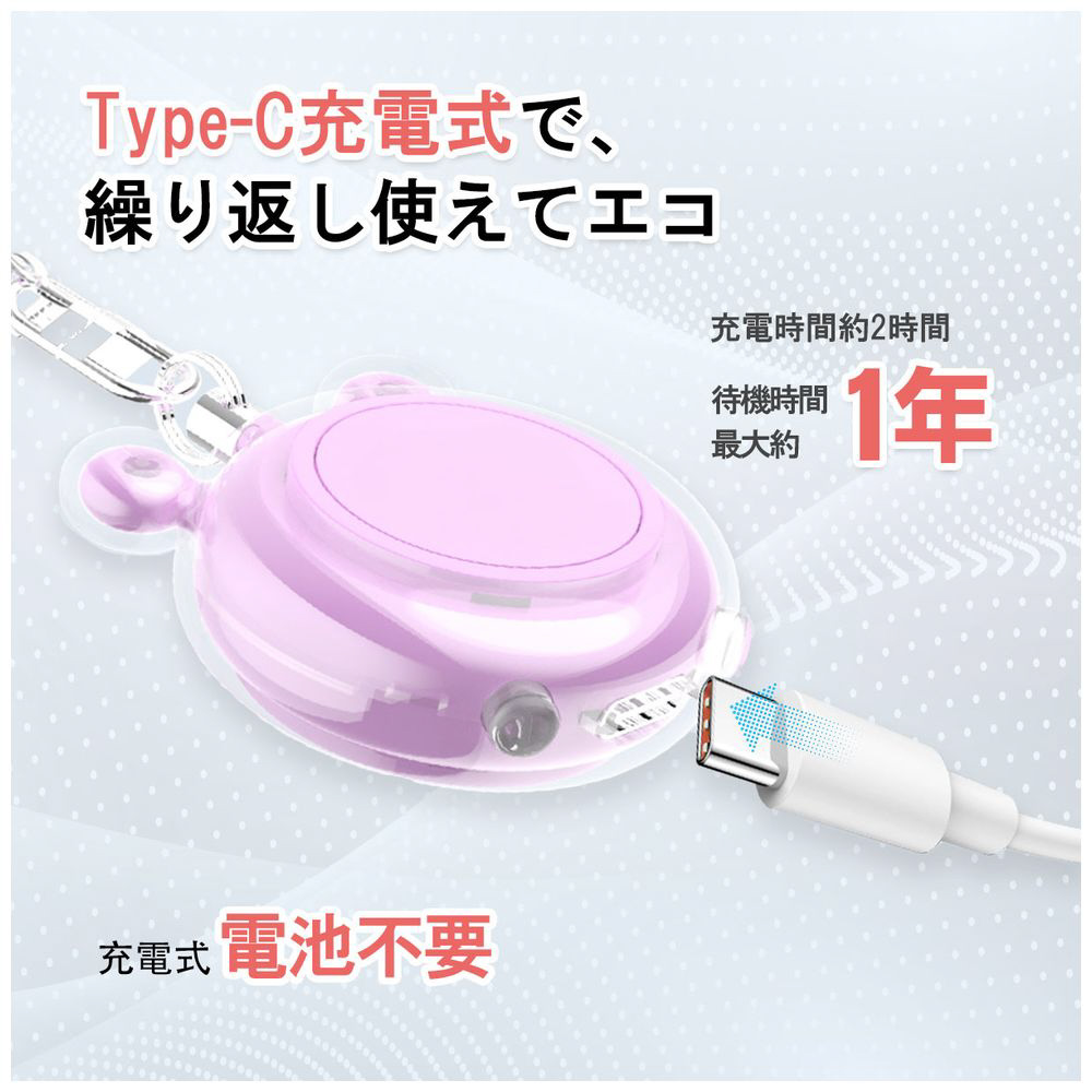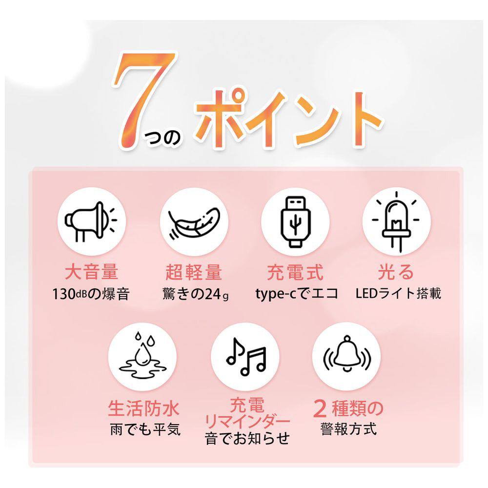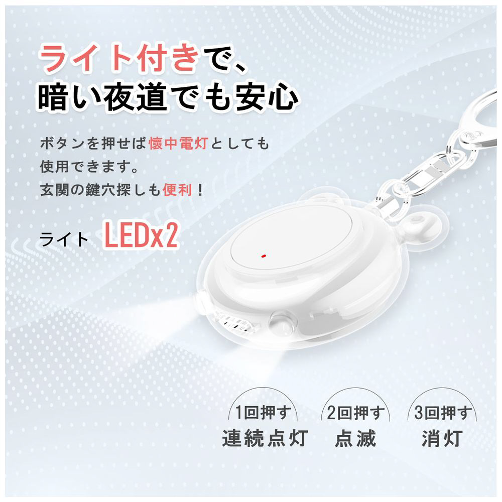 130dBの大音量!充電式で超軽量24gの防犯ブザー。ライト付き防水仕様で子どもから大人まで安心、通学や夜道の防犯対策はもちろん、防災グッズとしても最適です。