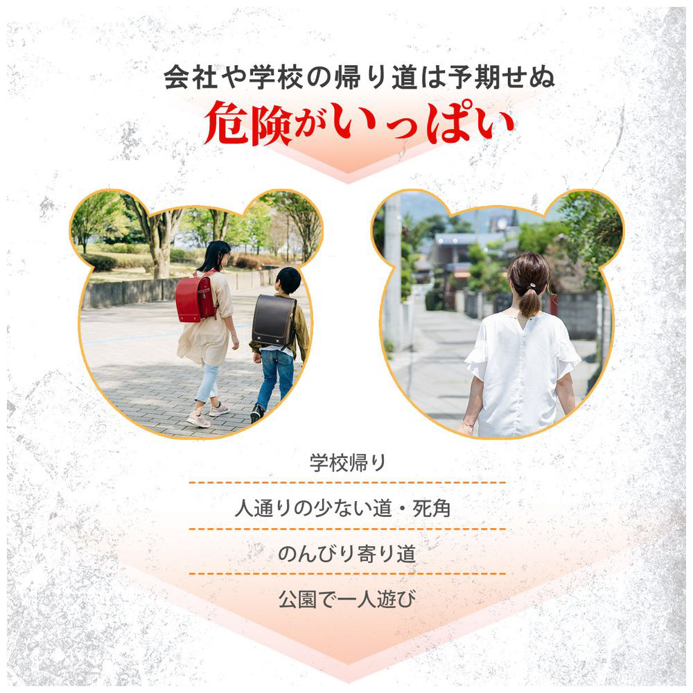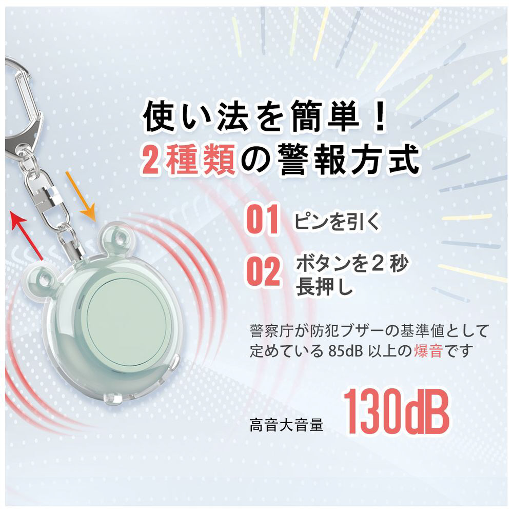 警視庁の防犯基準値85dBを大幅に上回る130dBの大音量。危険をしっかり周囲に知らせます。