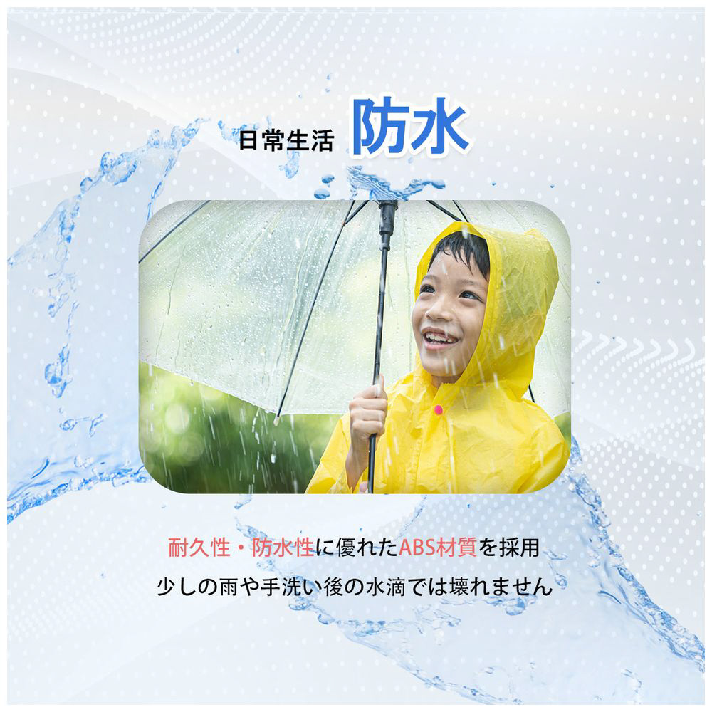 耐久性の高いABS素材を採用。雨や水滴程度なら問題なく使用できる防水仕様です。