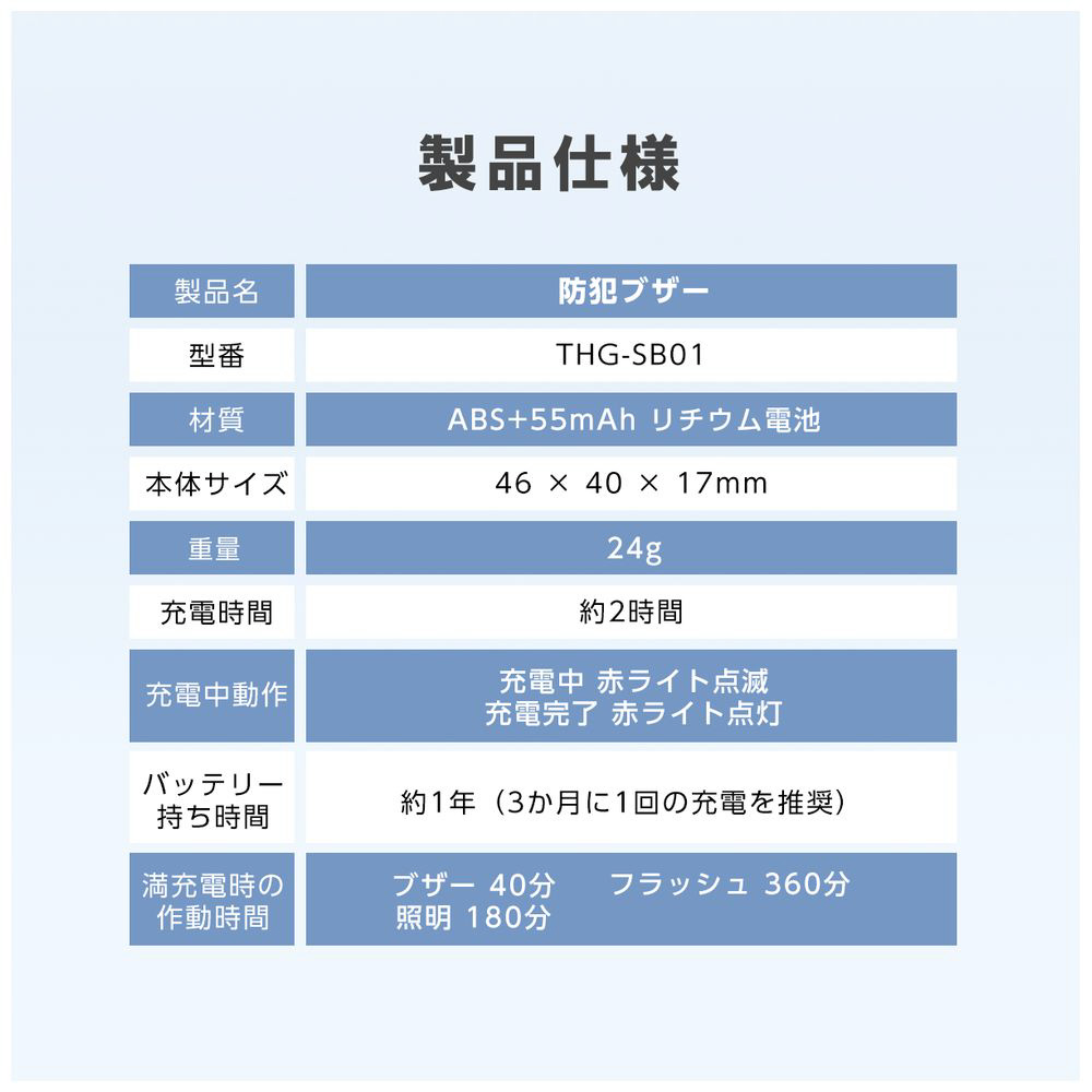 ・満充電の作動時間:ブザー40分、照明180分、フラッシュ360分