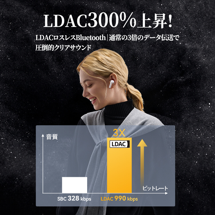 SBCの約3倍の情報量で、Bluetoothでも有線に匹敵するハイレゾ音質を提供します。
