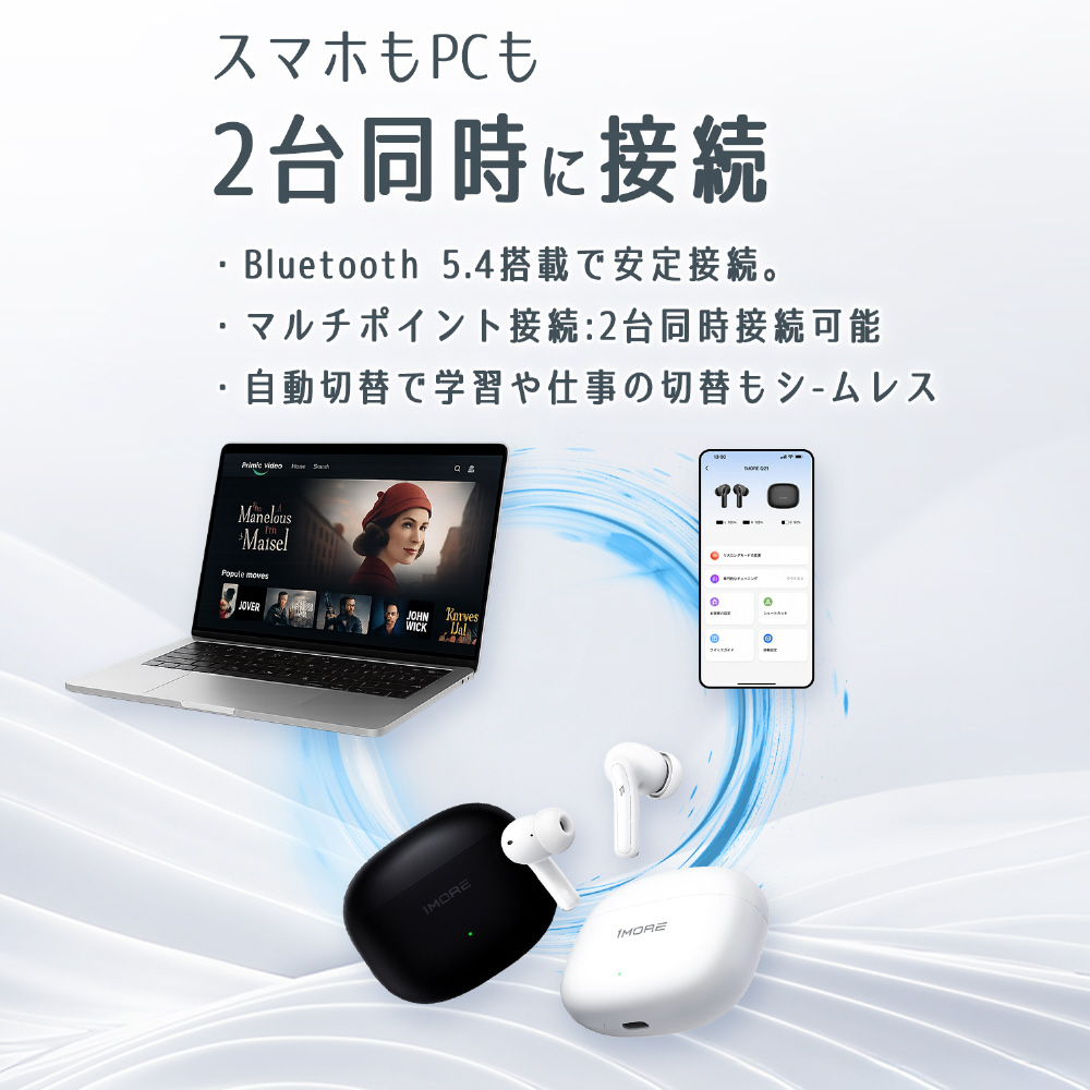 最新のBluetooth 5.4で安定した低遅延接続を実現。スマホとPCなど2台同時に接続でき、学習・仕事・音楽鑑賞の切り替えもスムーズです。