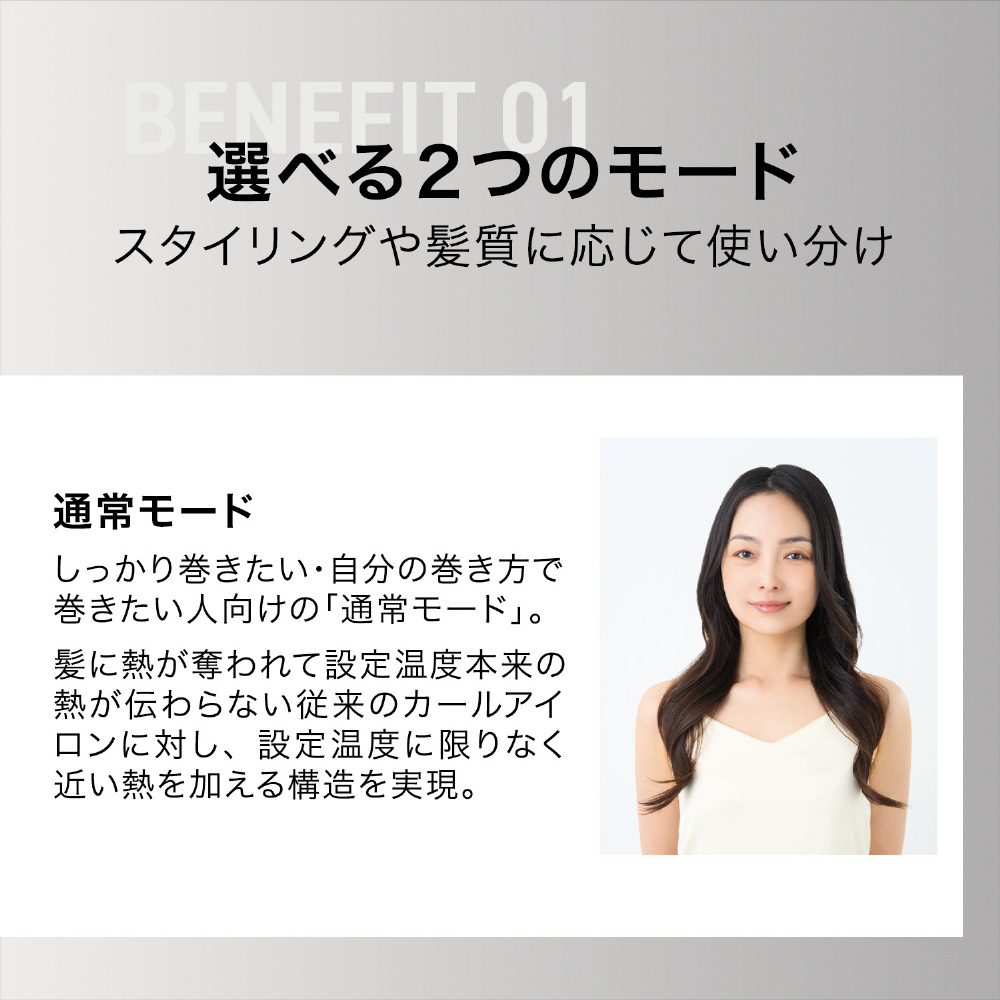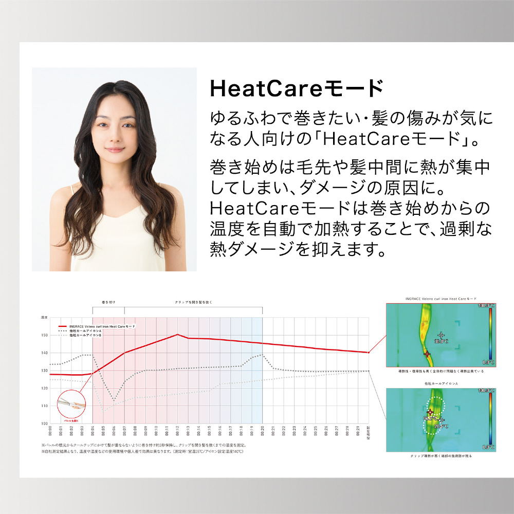 巻き始めの毛先や髪中間に熱が集中してしまう従来のカールアイロンに対し、温度を自動調整するダメージケアモードを採用。